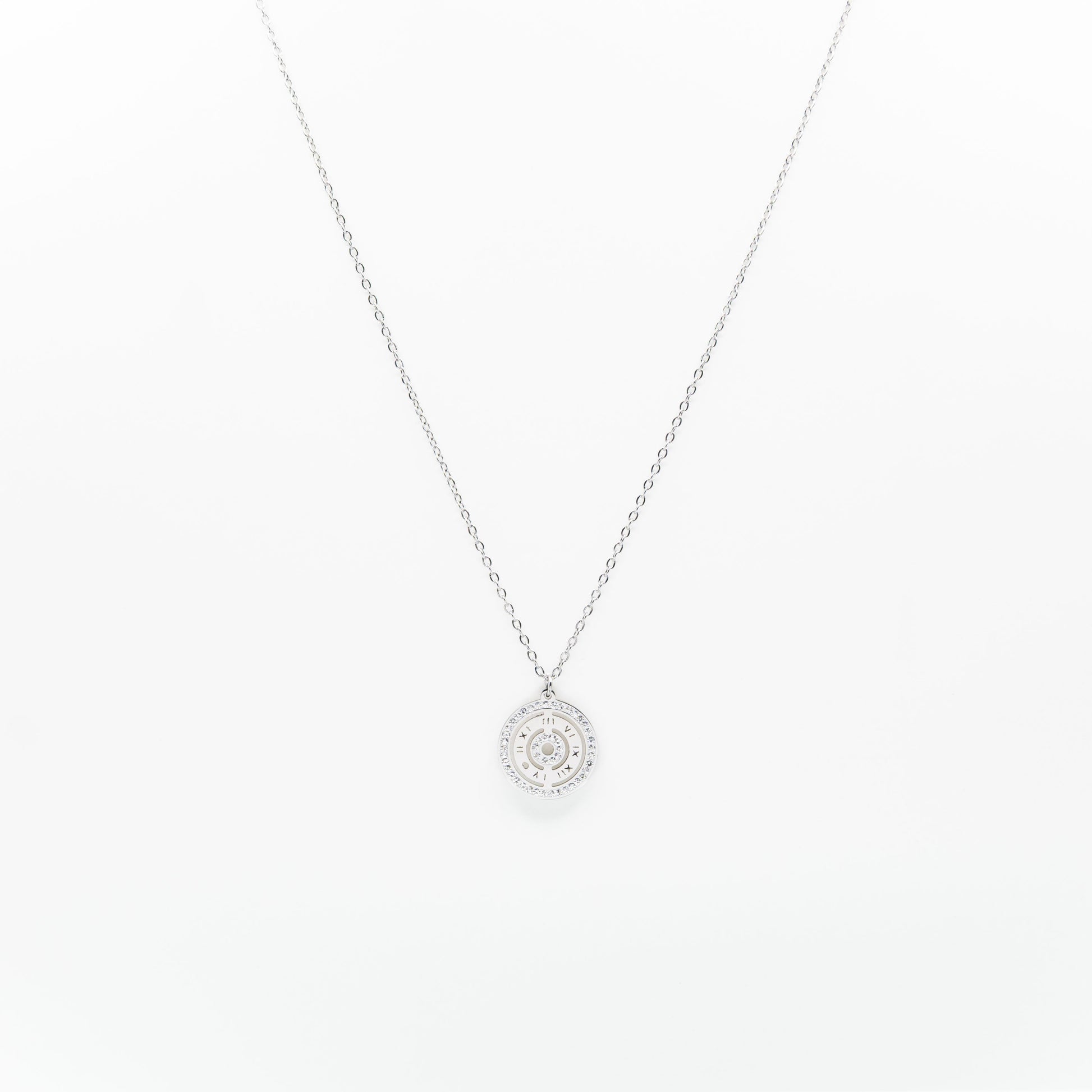 Collar de cadena plateada con dije de reloj y anillos de strass blanco.
