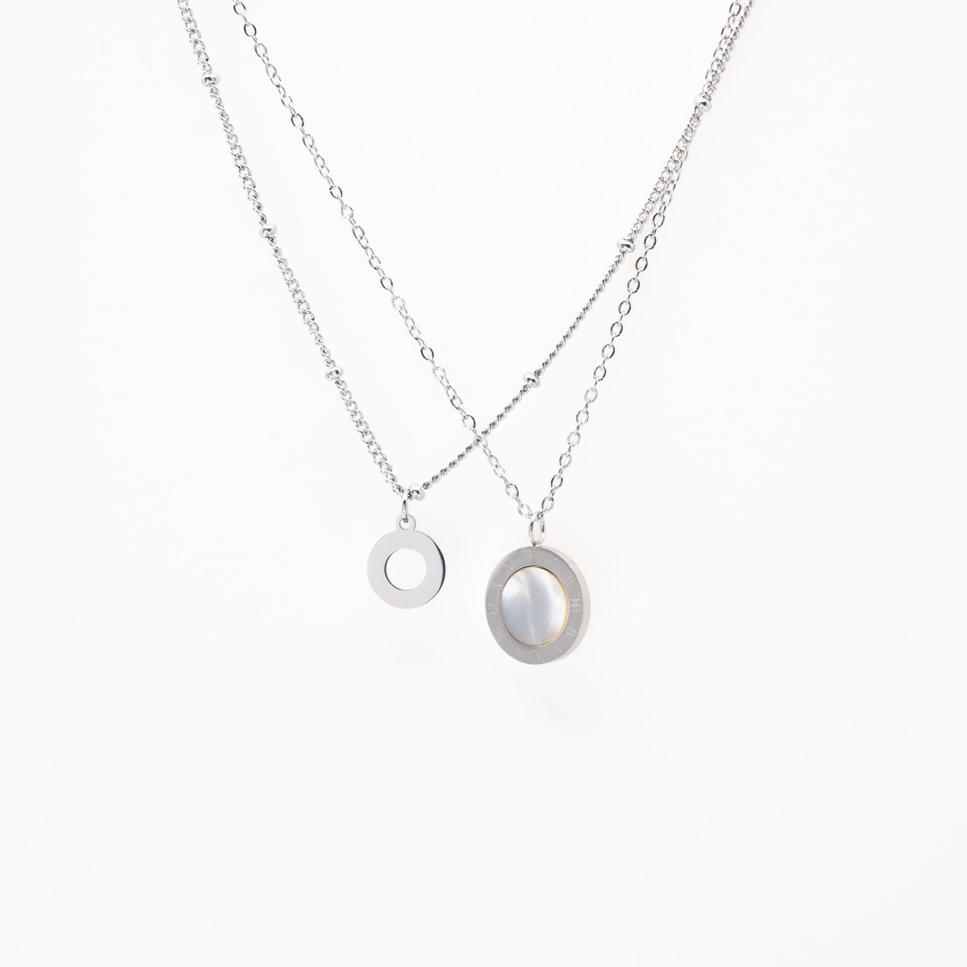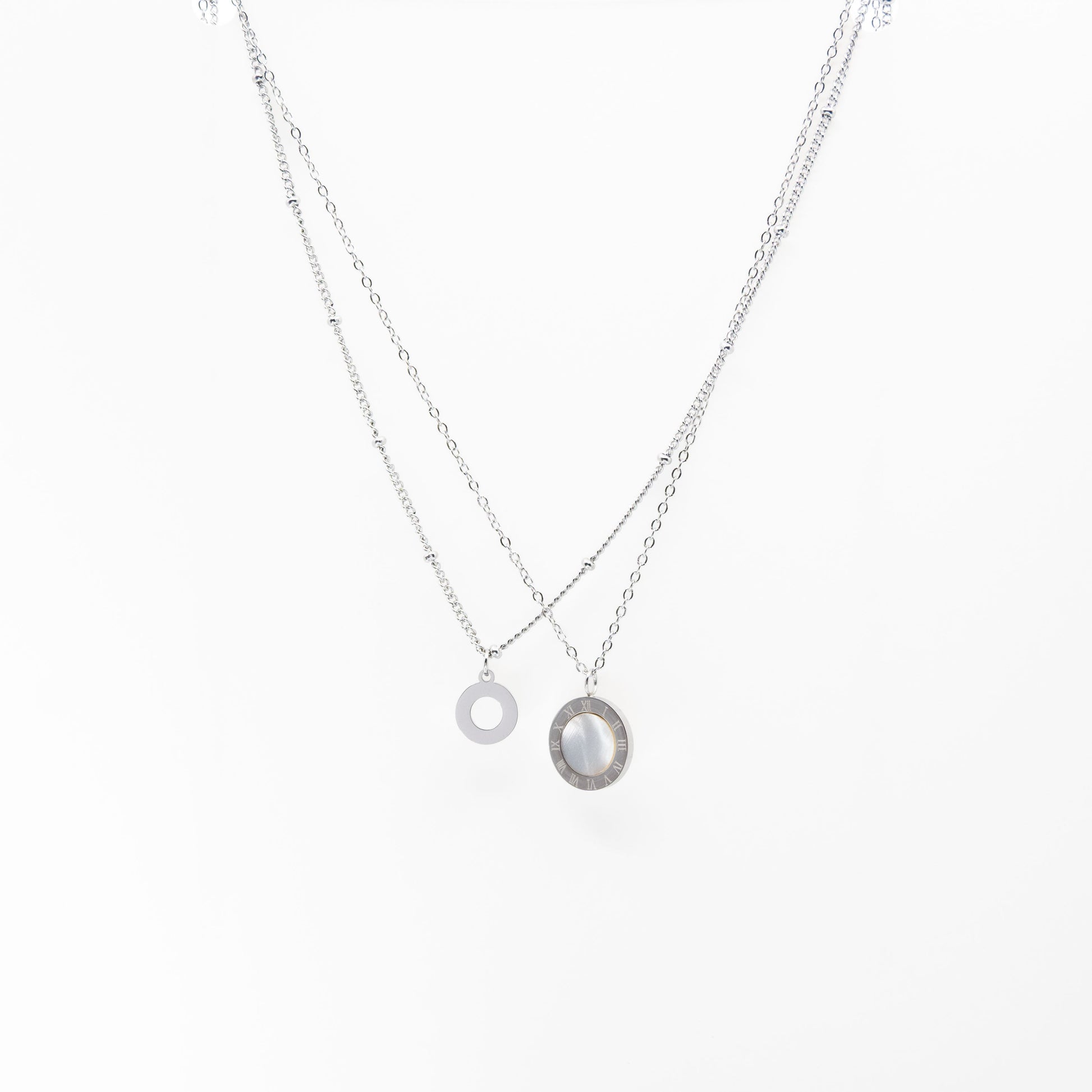 Collar multicadena plateado con dijes de aro y reloj con centro de acrílico blanco marmoleado.