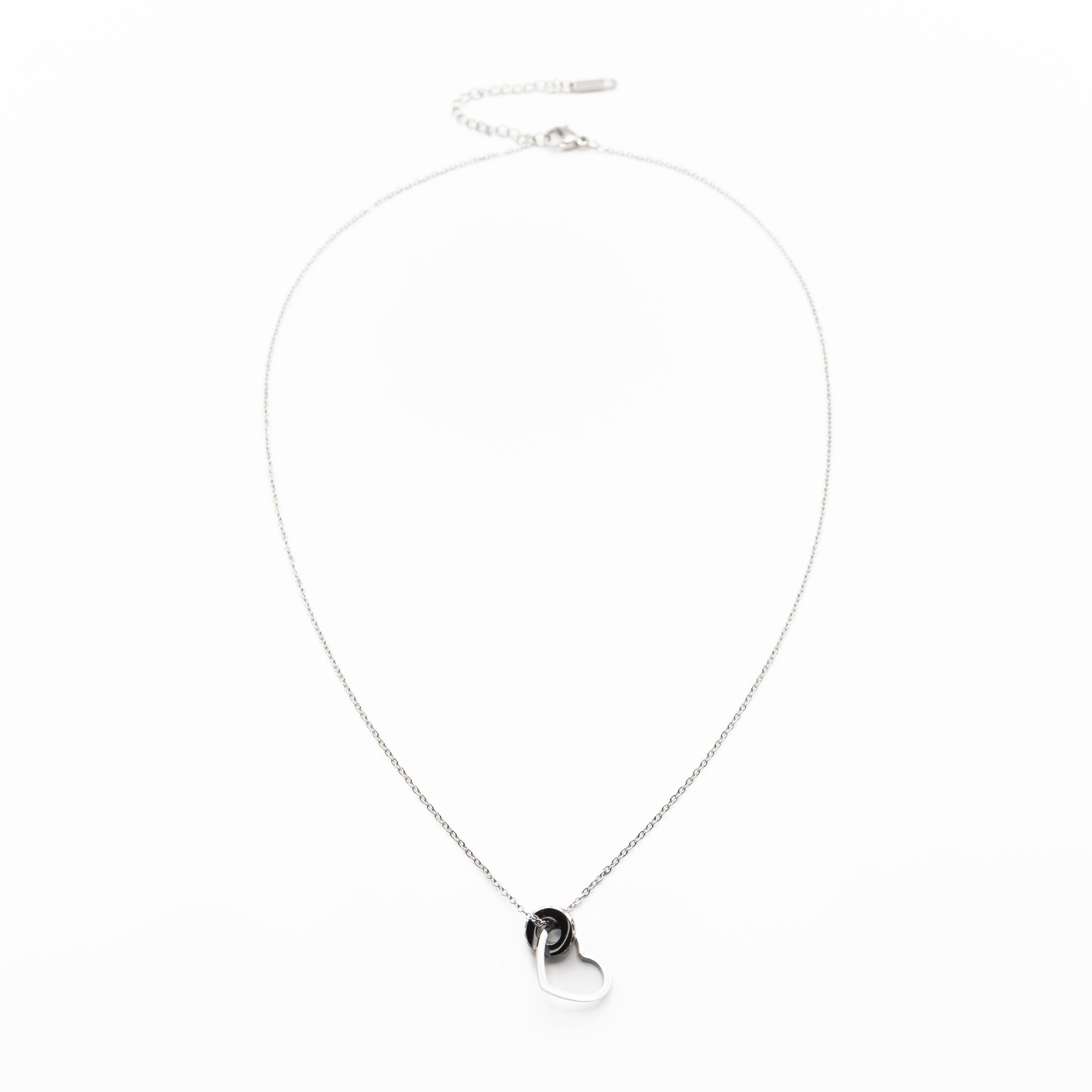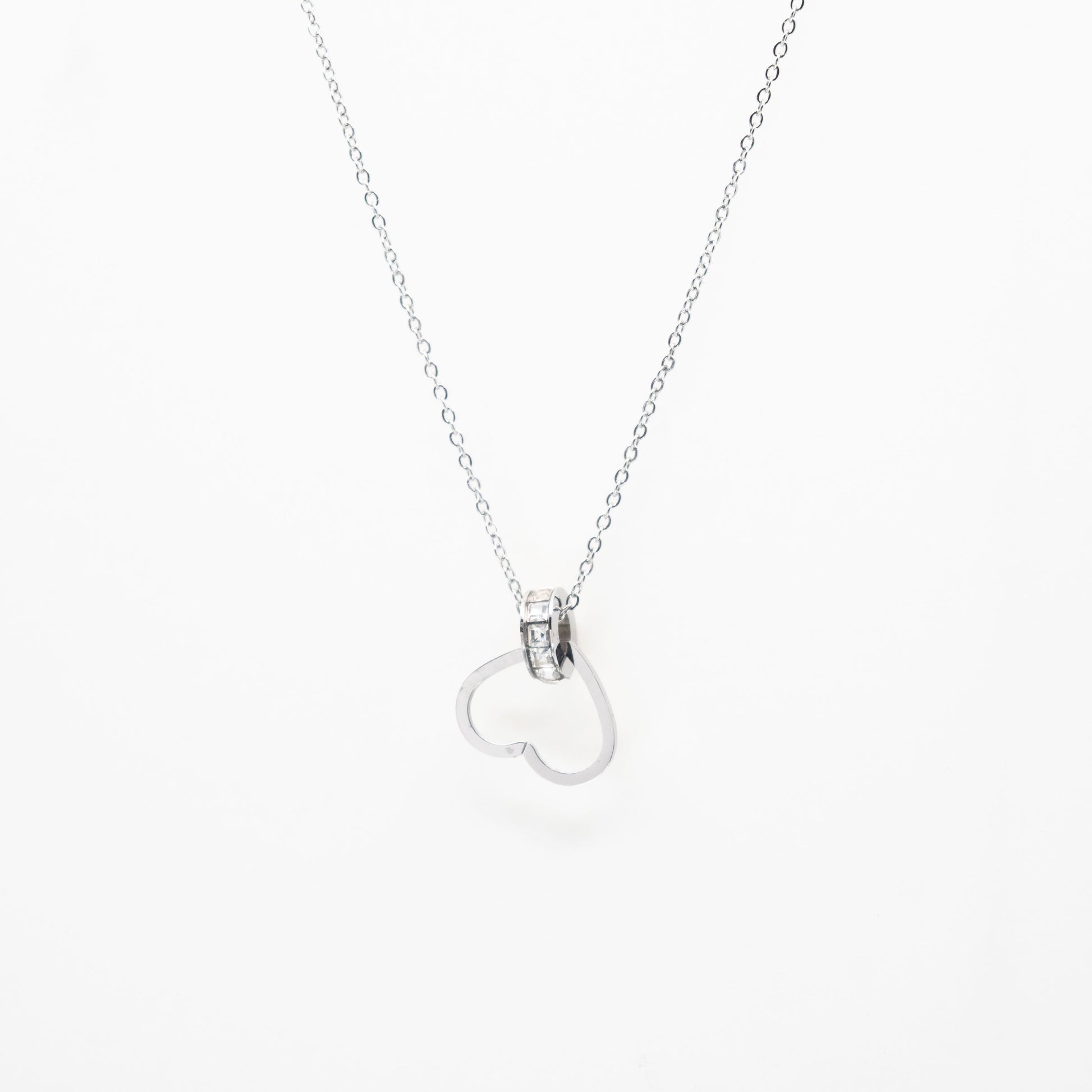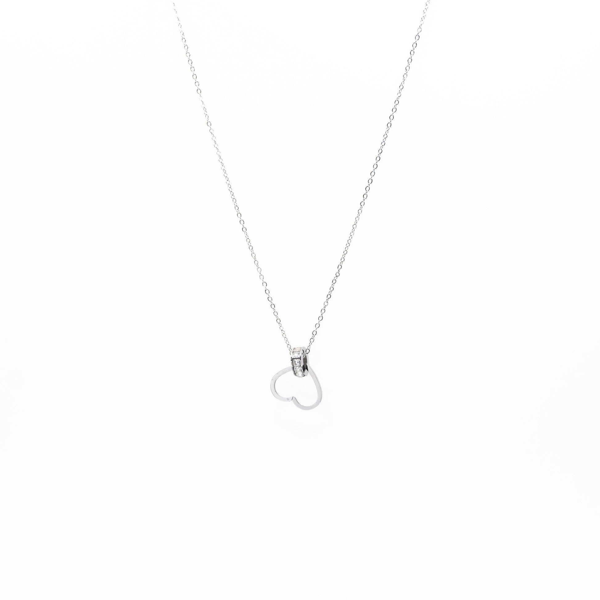Collar de cadena plateada con dije de anillo strass con corazón calado.