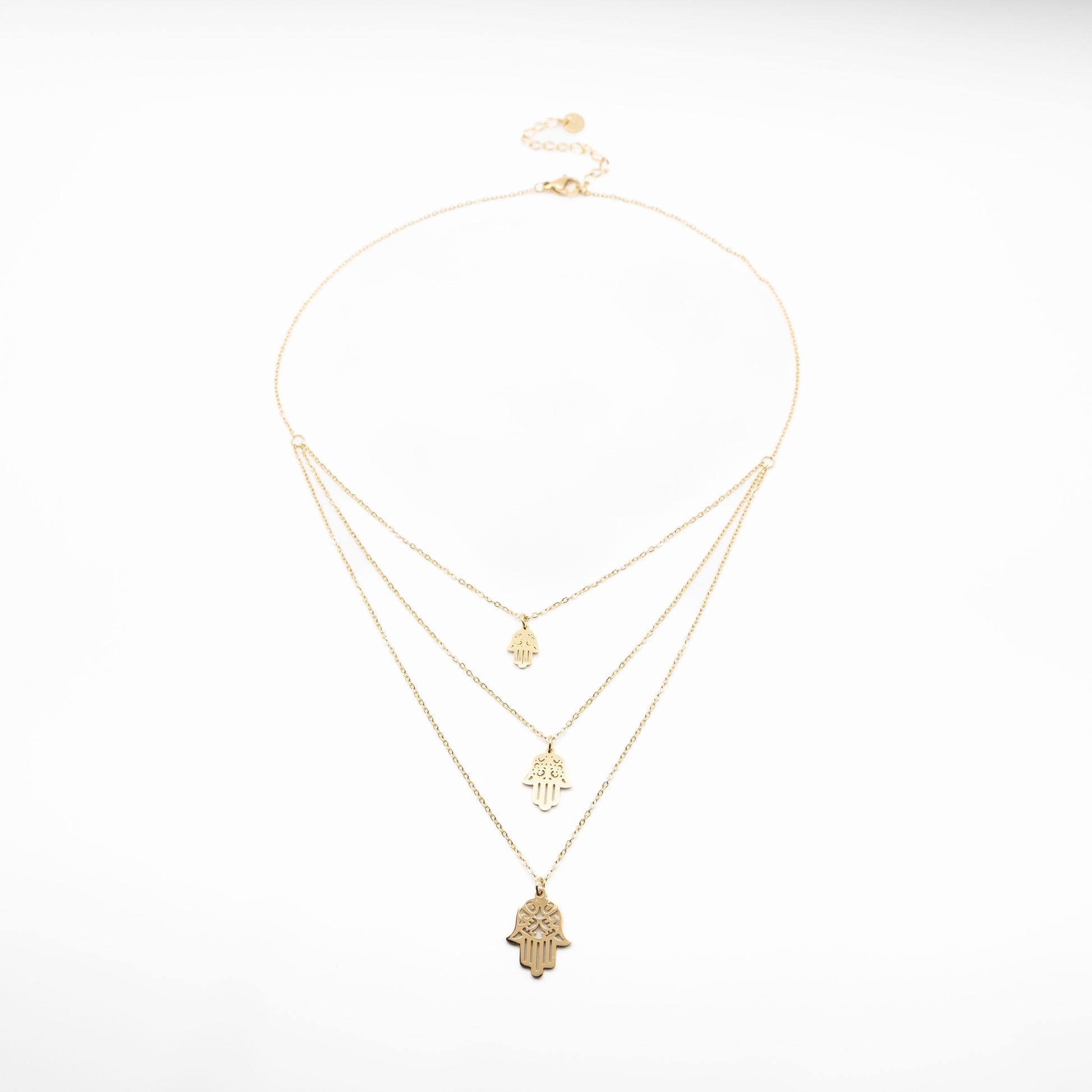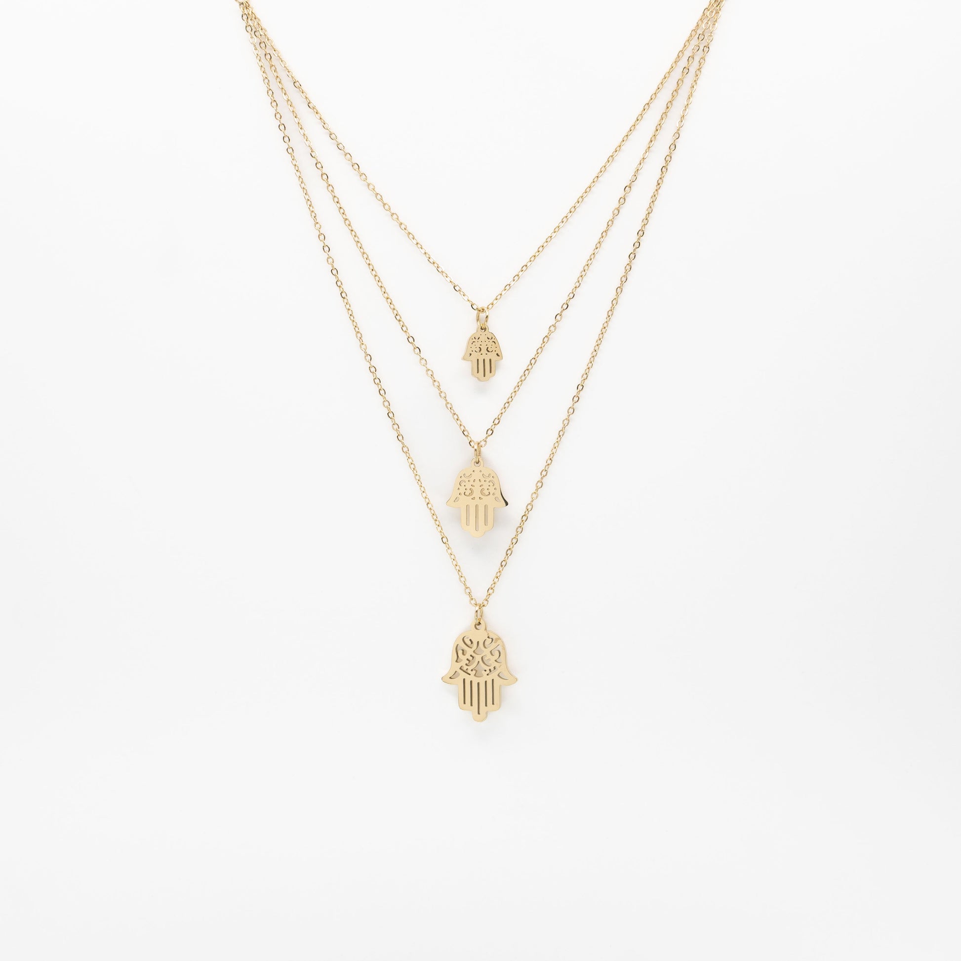 Collar multicadena dorado con dijes calados de mano de Fátima.