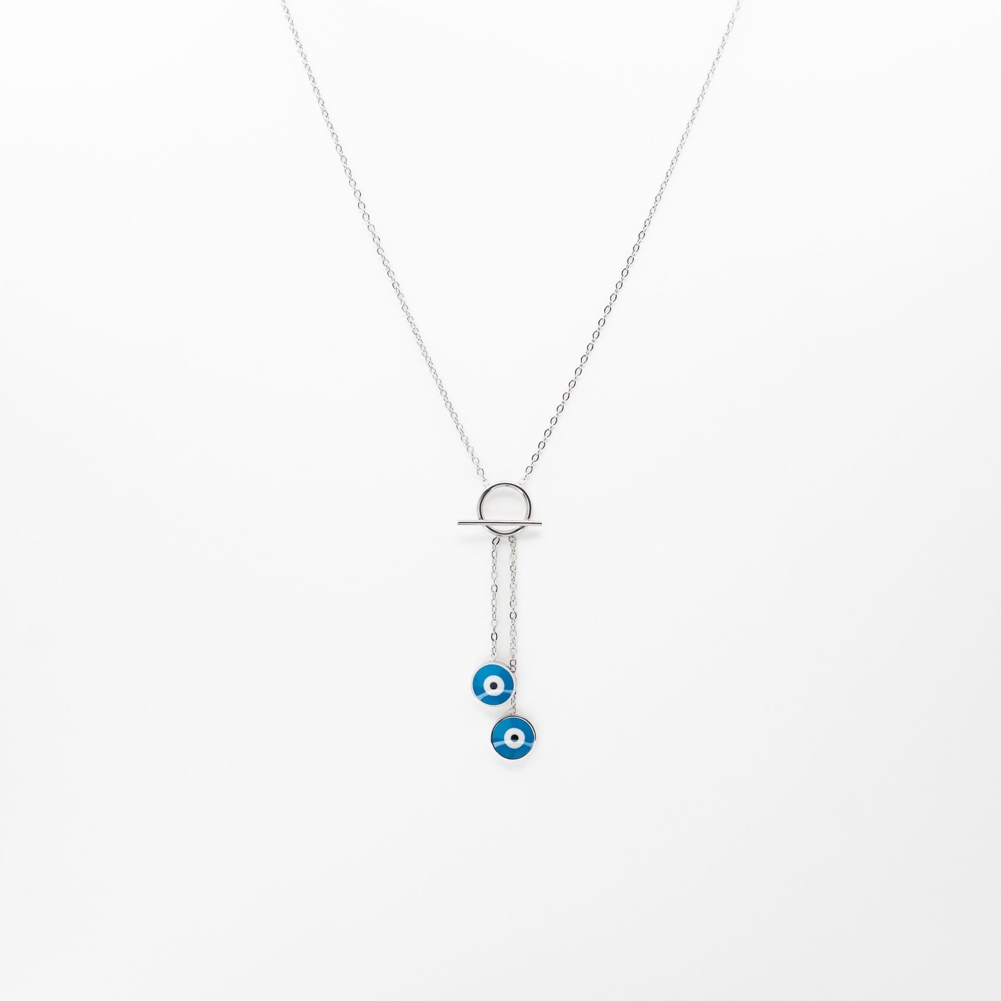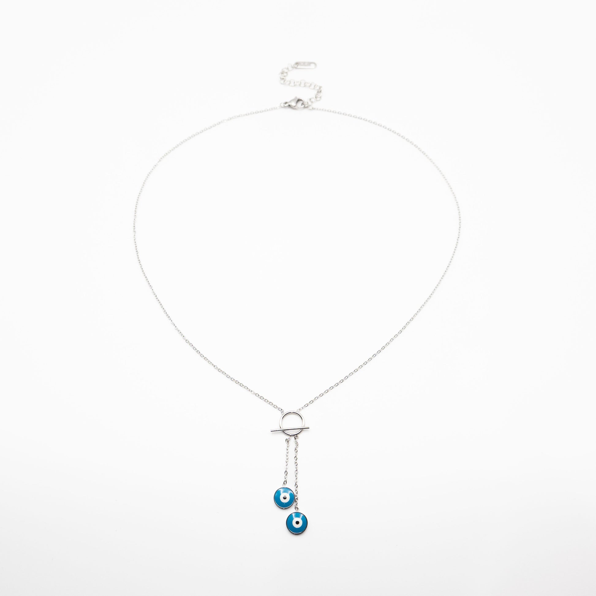 Collar de cadena plateada con dijes colgantes de ojos azules.