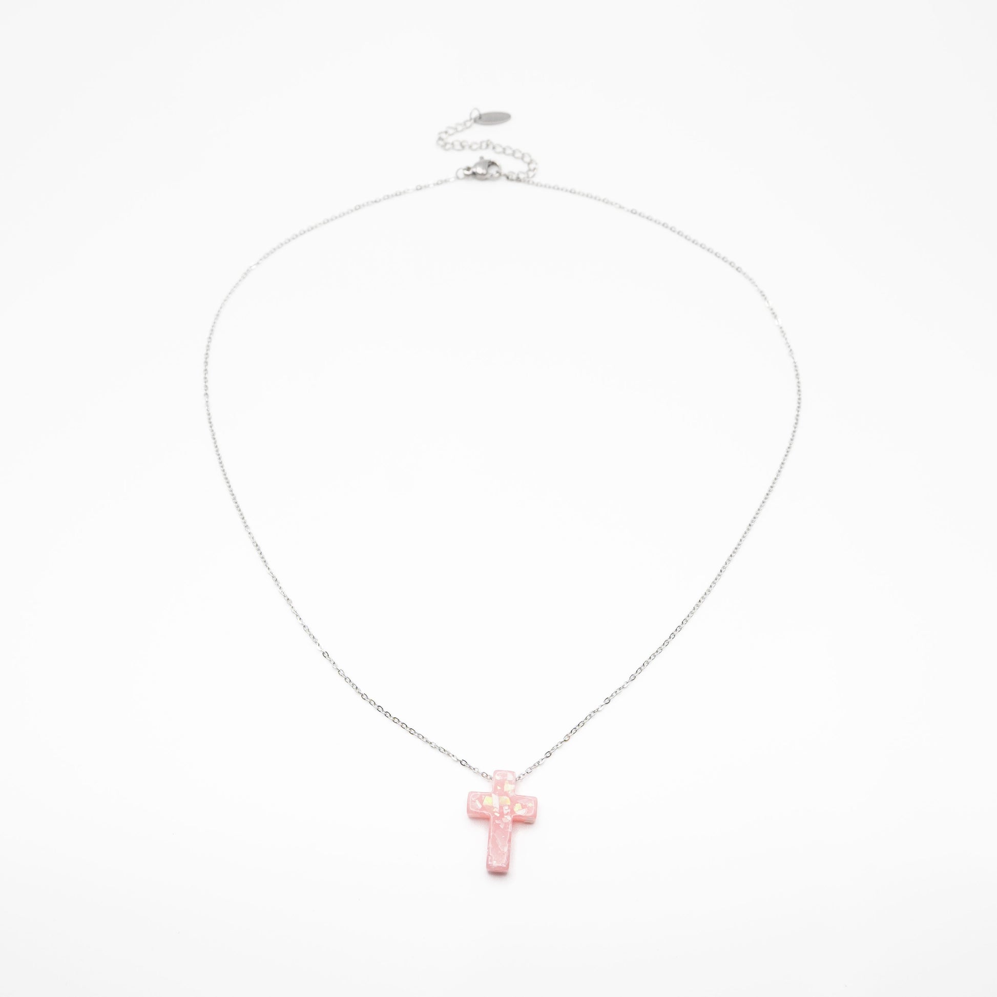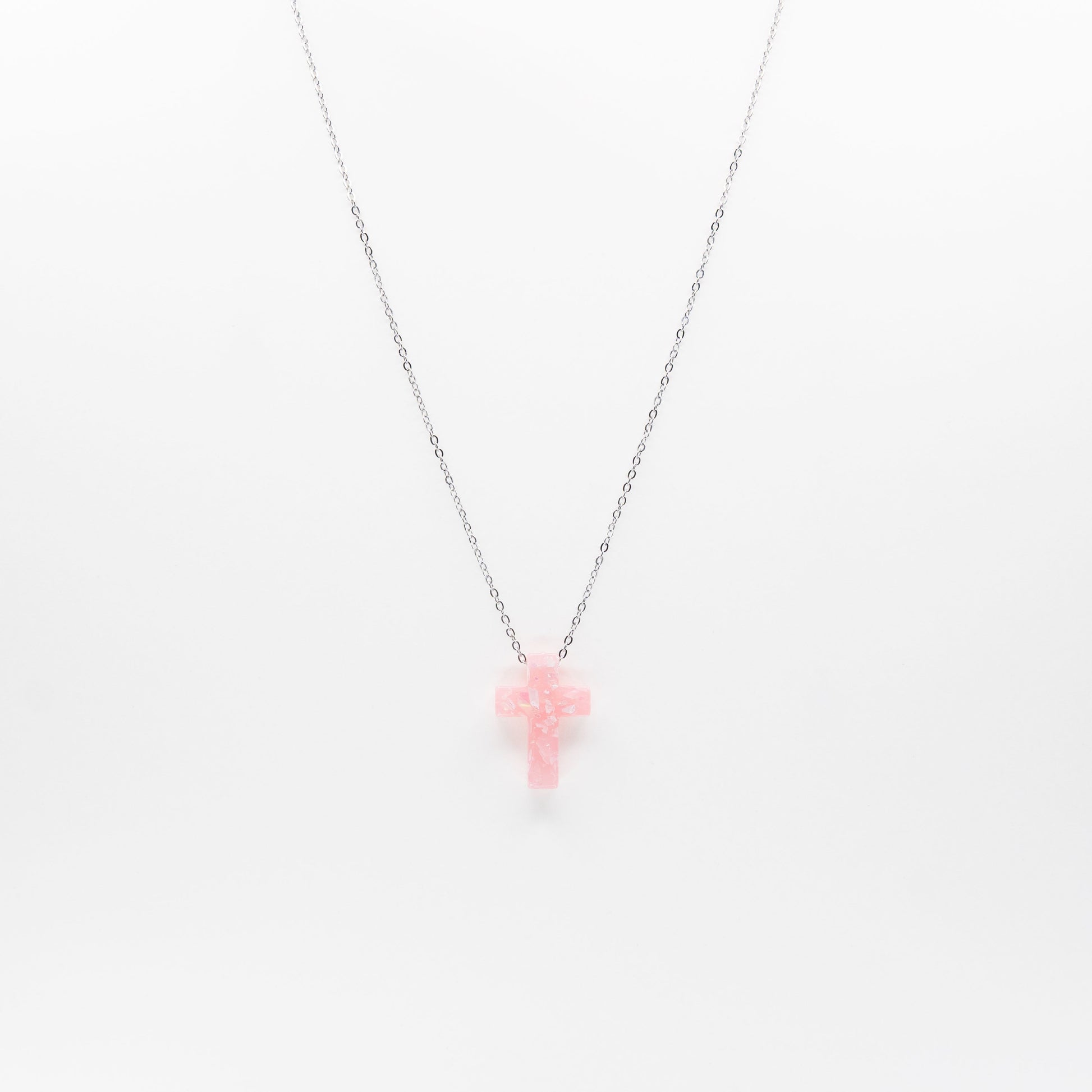 Collar de cadena plateada con dije de cruz en piedra rosa marmoleado.