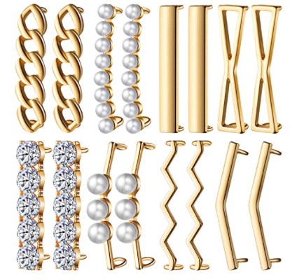 Hay 2 agujeros redondos en el lateral de los clips de zapatos, que son fáciles y rápidos de usar sin que se caigan fácilmente, lo que te ofrece una agradable experiencia de uso. Simplemente pasa el bucle de los cordones de perlas de imitación a través del cordón, se puede fijar firmemente en el cordón, y también puedes elegir el número correcto de clips de decoración de tenis de acuerdo a tu preferencia.