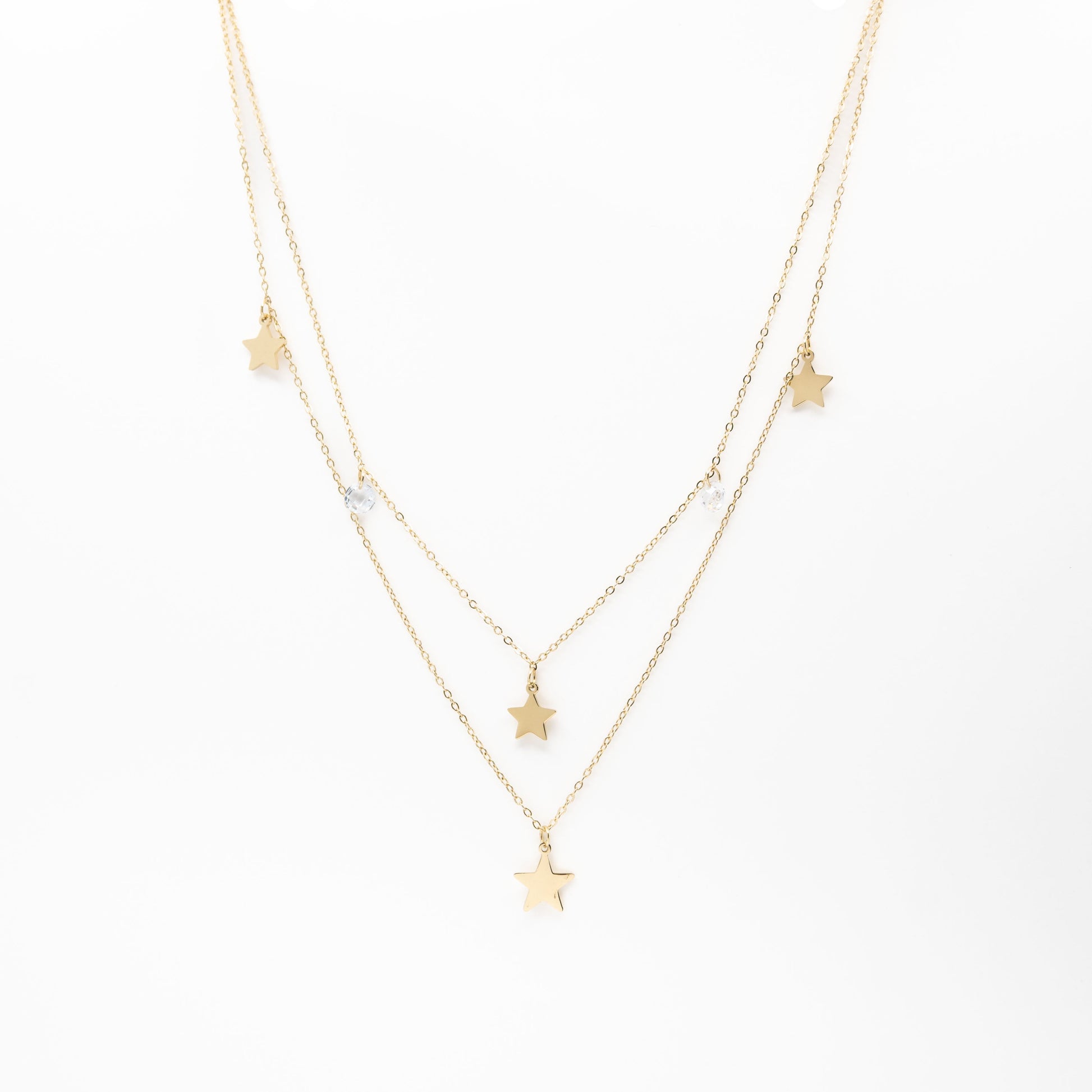 Collar multicadena dorado con dijes de estrellas y cubic zirconias.
