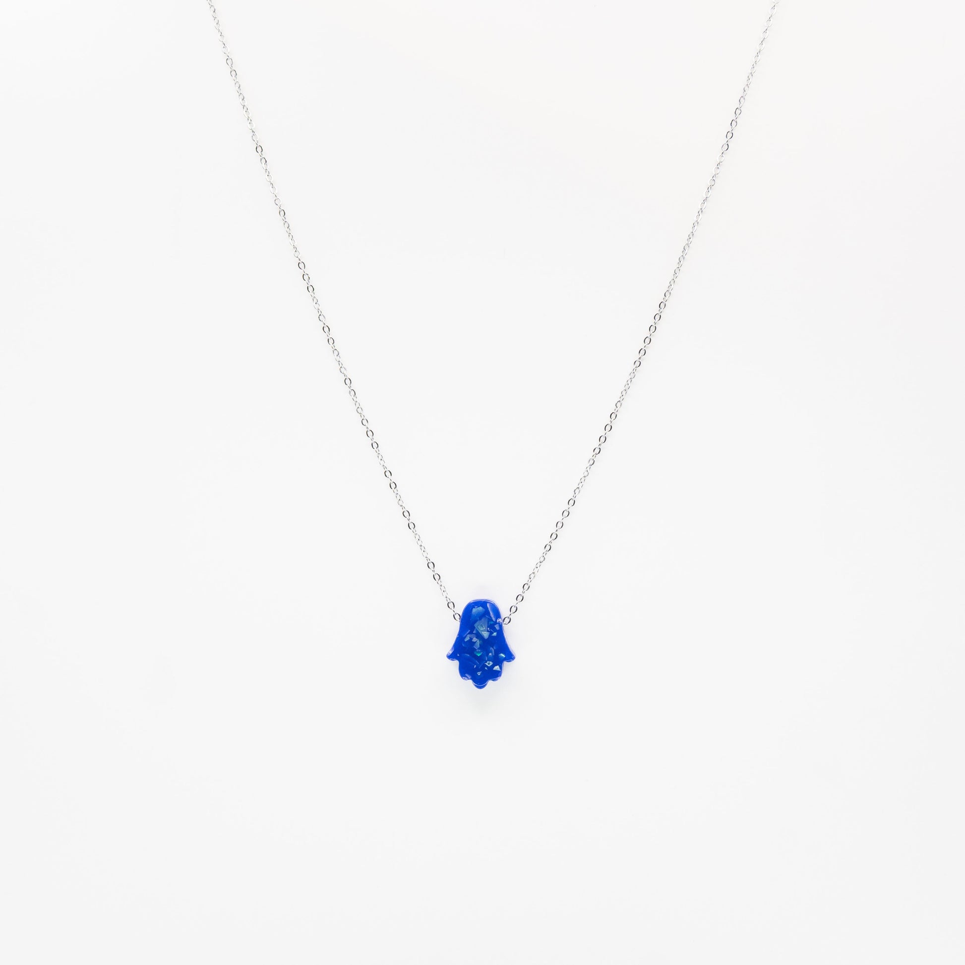Collar de cadena plateada con dije de mano en piedra azul marmoleada.