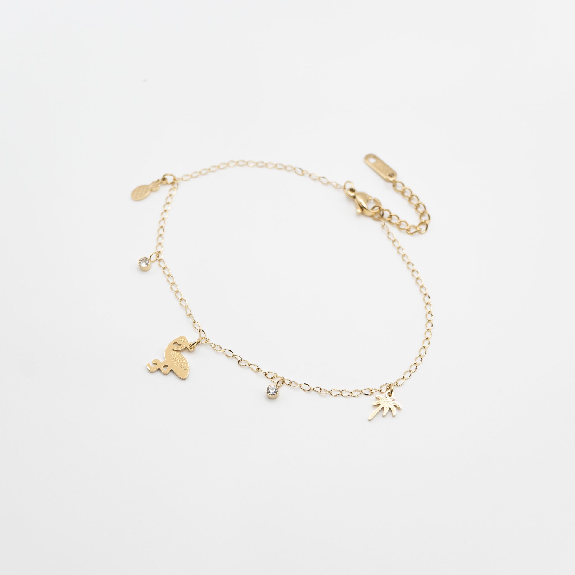 Pulsera de cadena dorada con dije de flamingo, palmera, piña y dijes circulares de cubic zirconia.