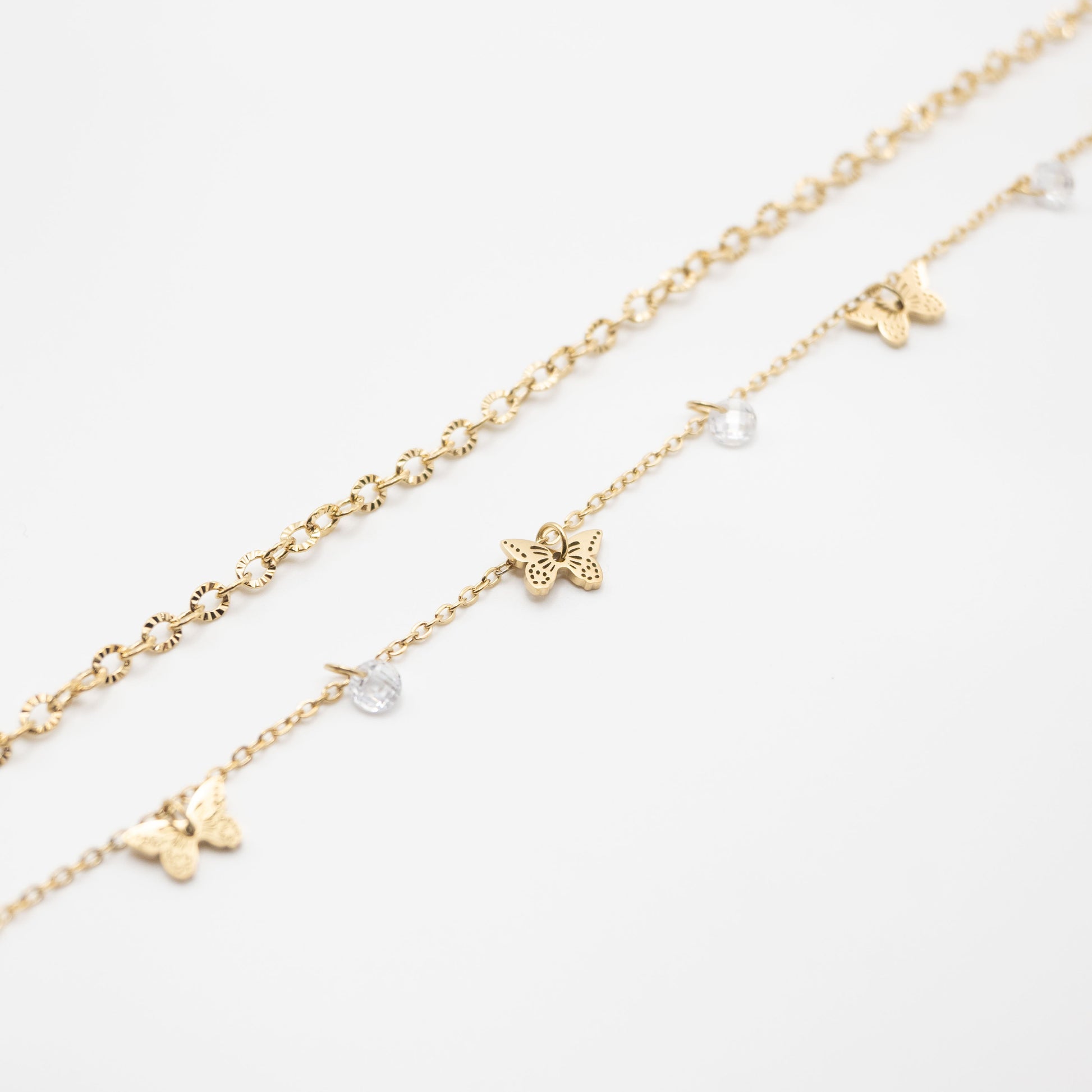 Pulsera multicadena normal y tipo lip dorada con dijes de cubic zirconia y dijes calados de mariposas.