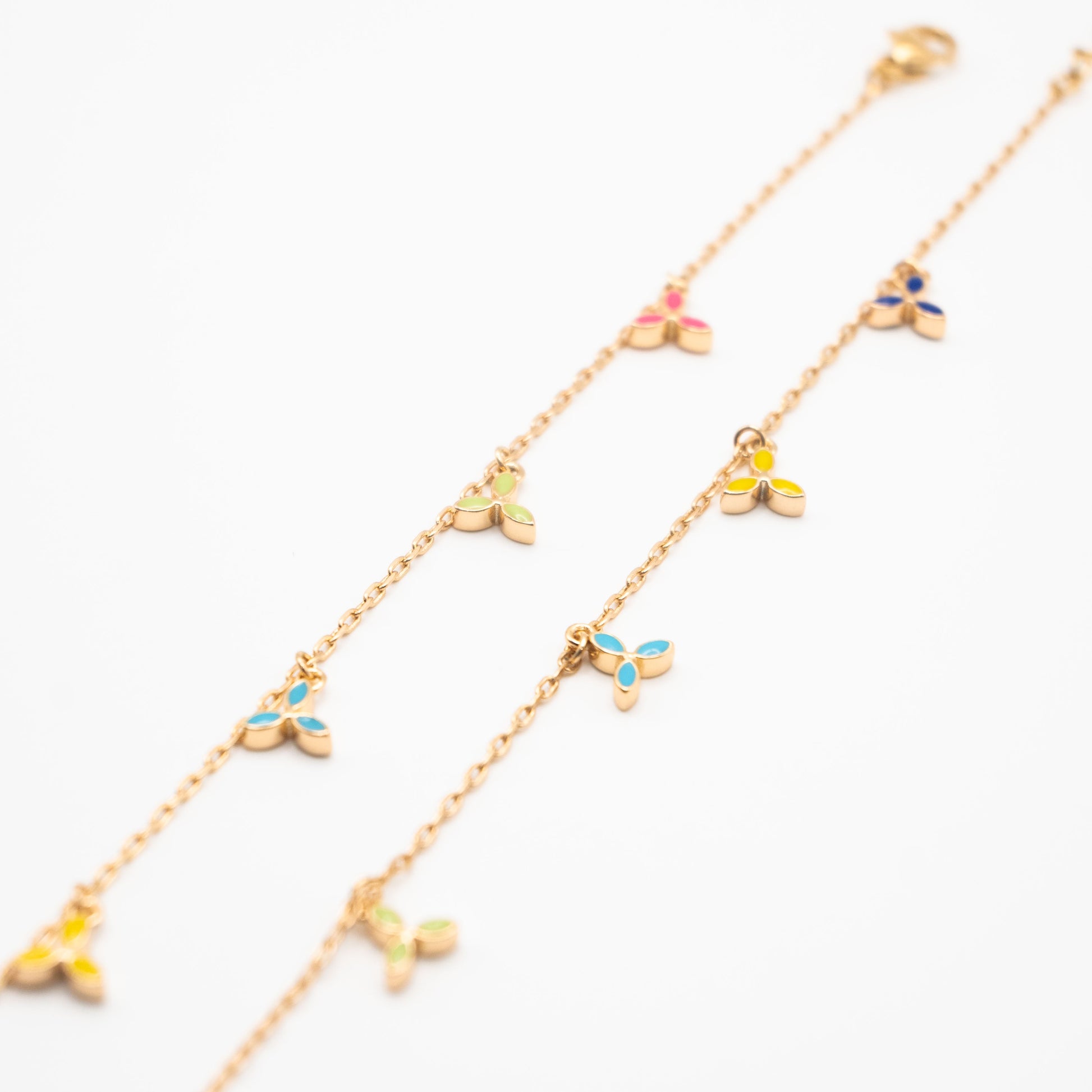 Pulsera pequeña de cadena dorada con charms rosa, verde, turquesa, amarillo y azul.