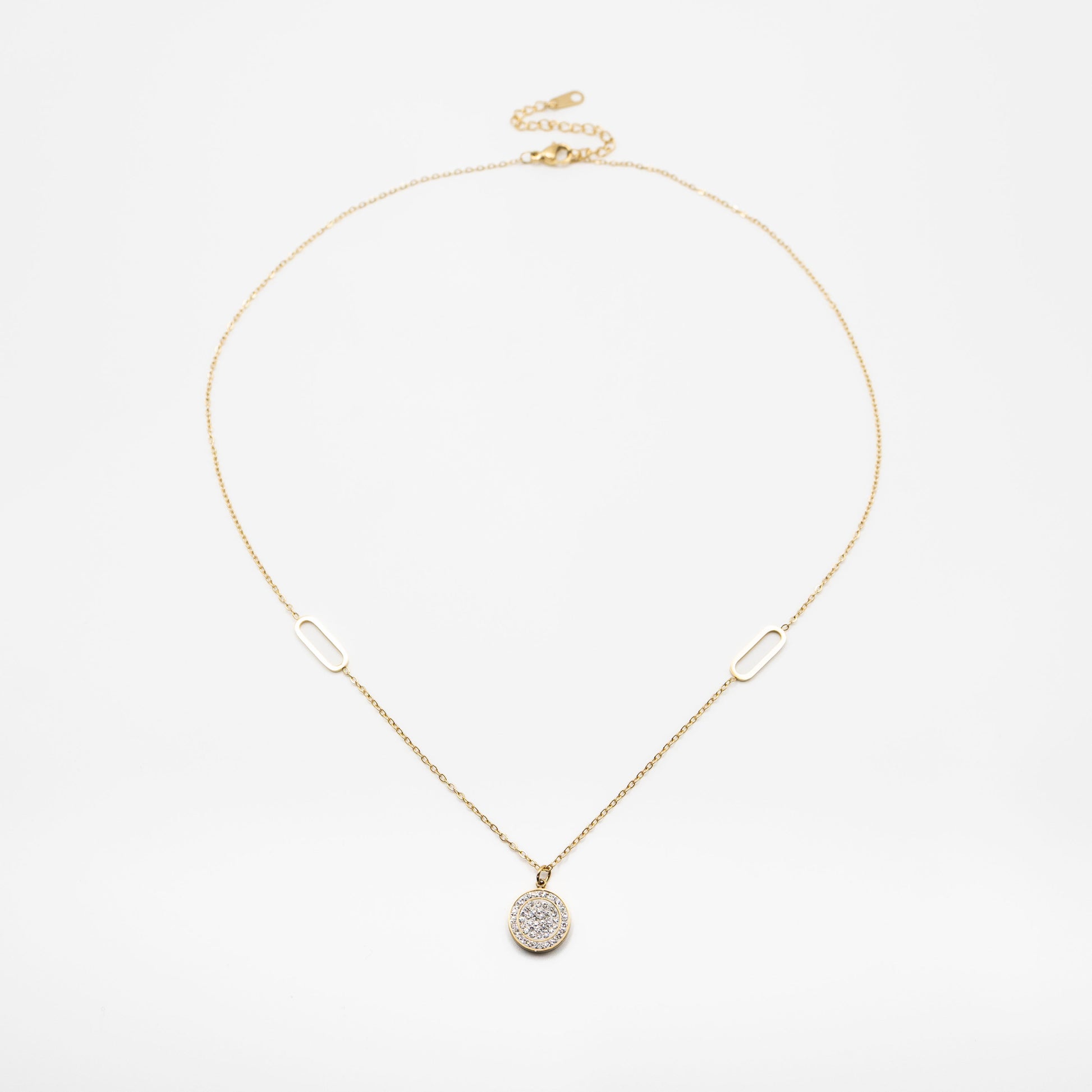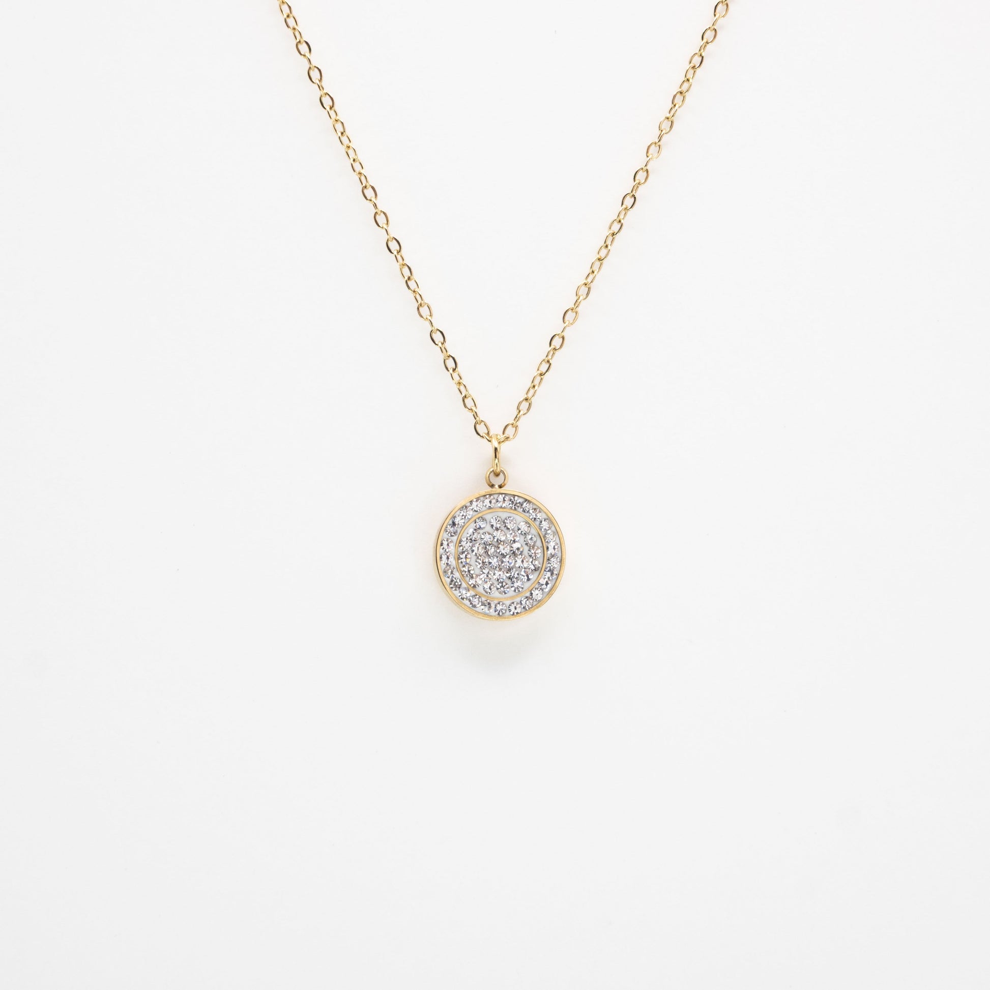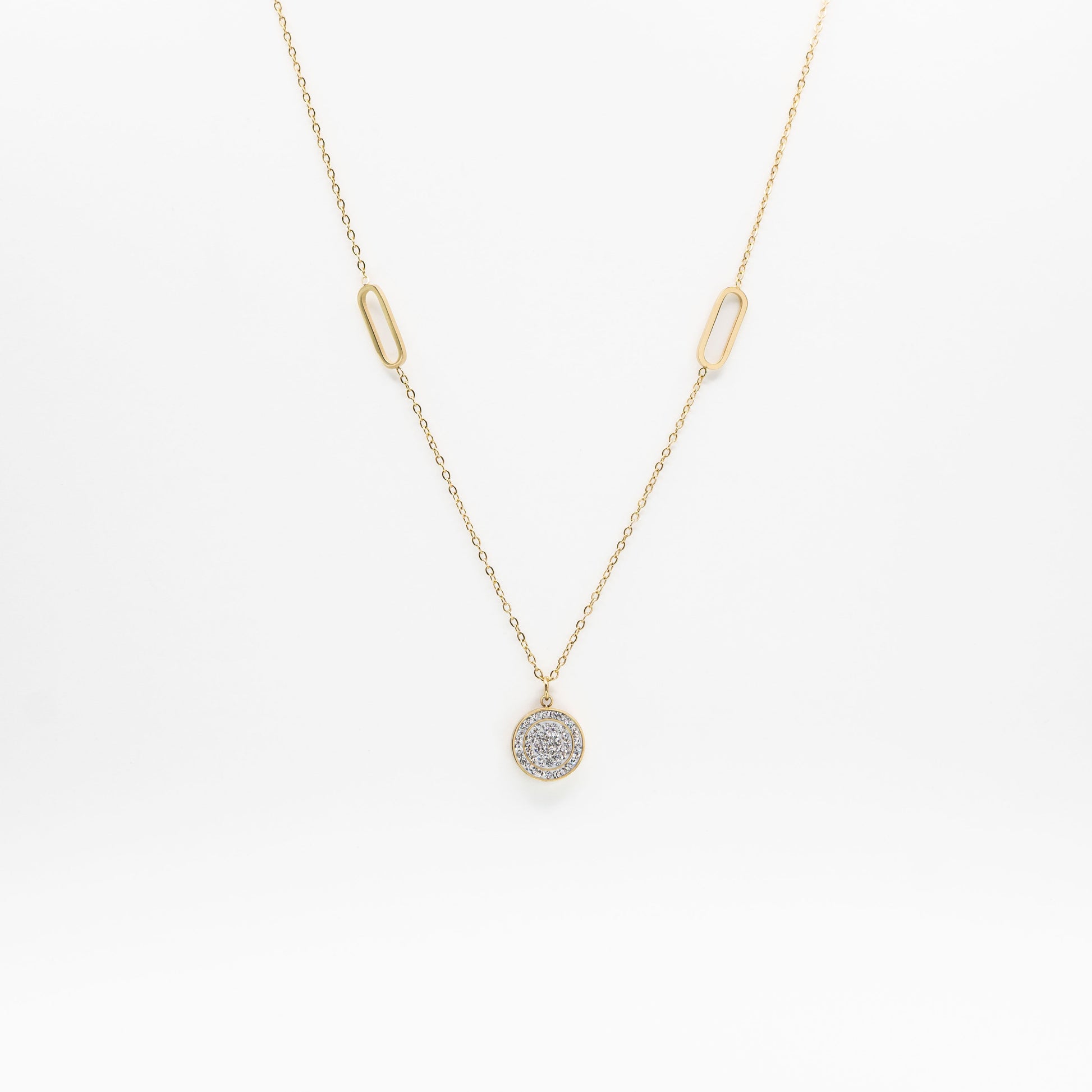 Collar de cadena metálica dorada con dije circular de strass con detalles de acero en la cadena.