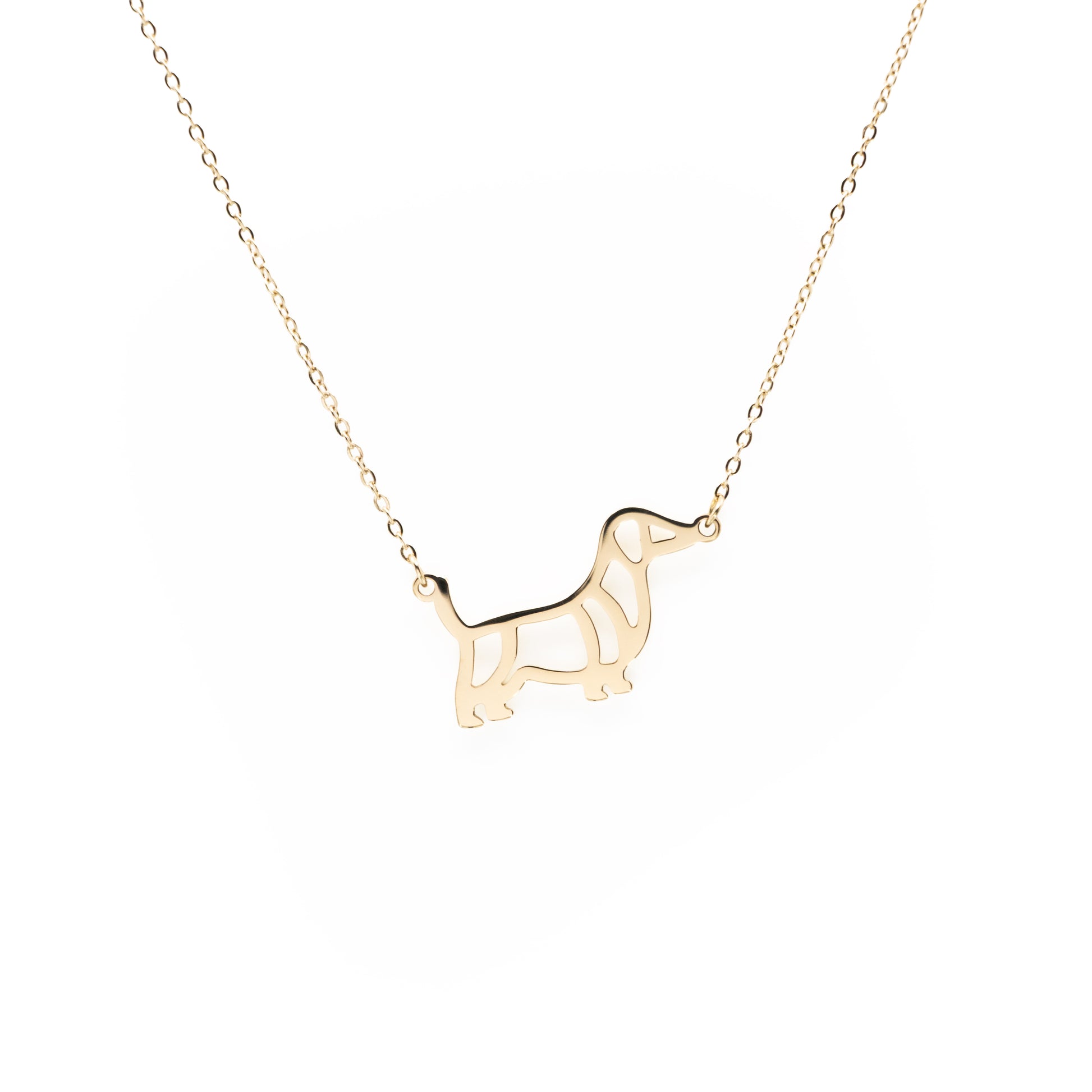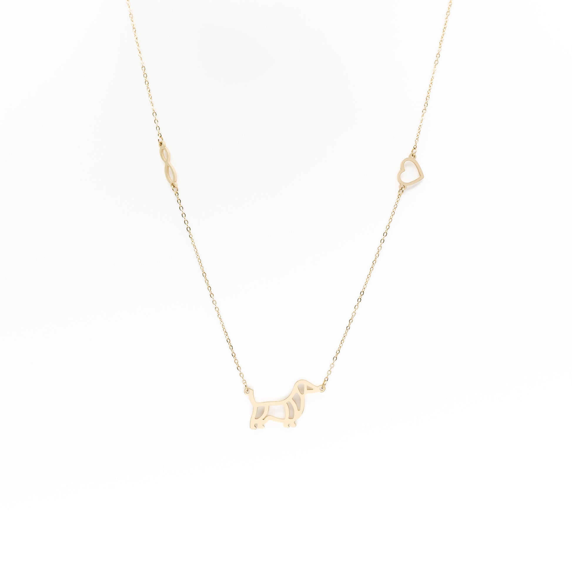 Collar dorado multicadena con dije calado de perro salchicha y dijes de corazón e infinito en cadena.