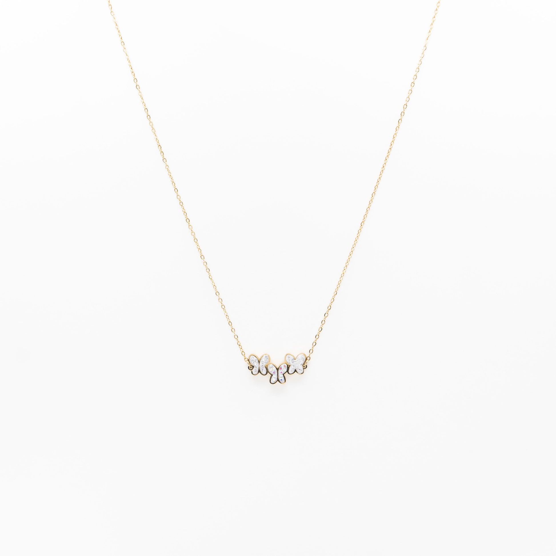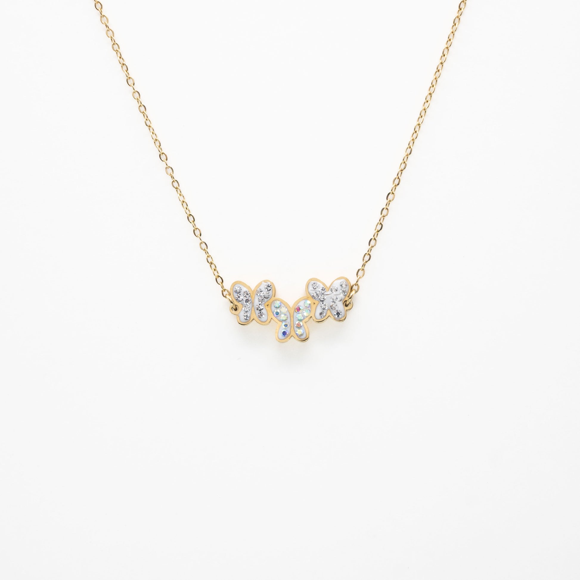 Collar de cadena dorada con dije de mariposas con strass blanco.