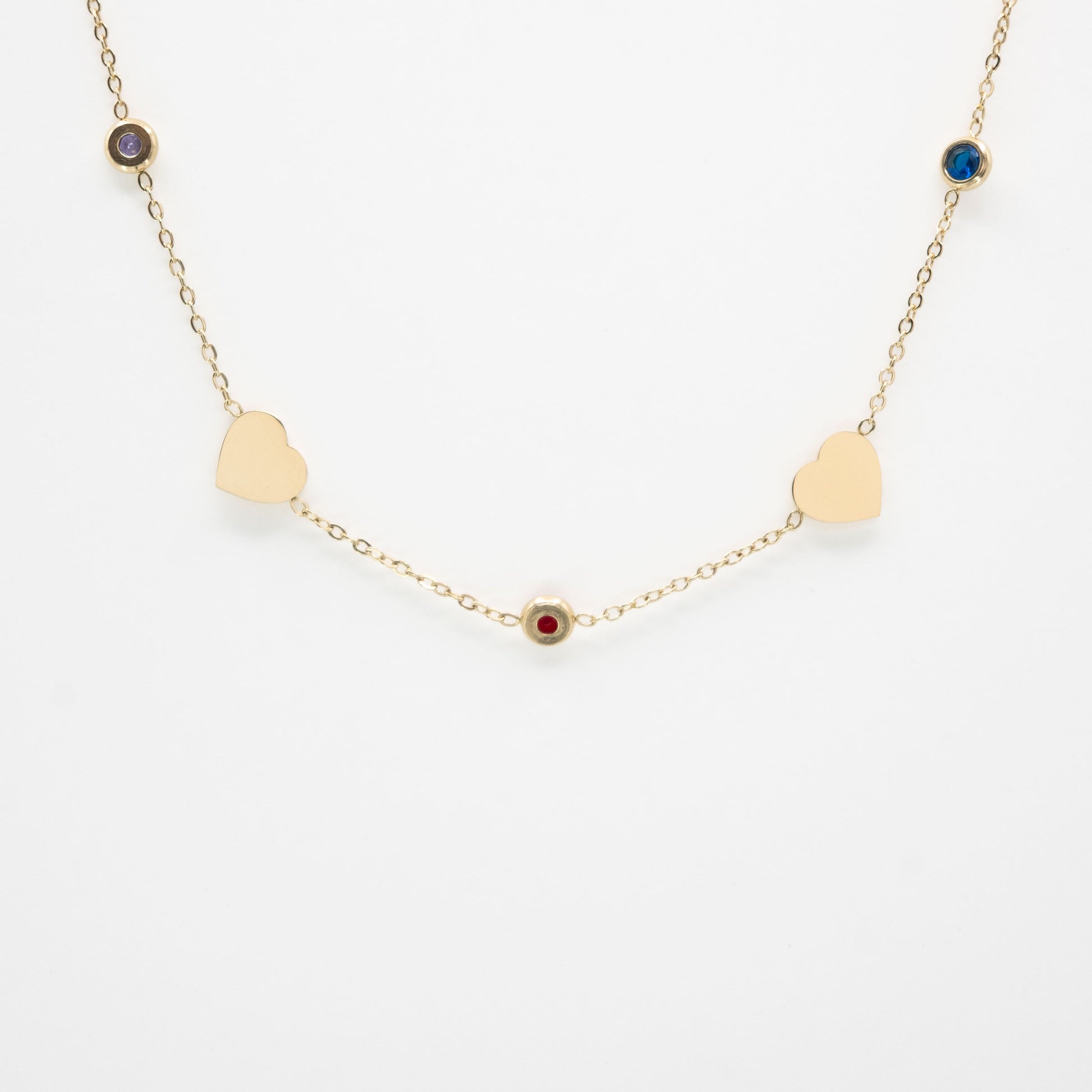 Collar de cadena dorada con dijes de corazón y detalles de cubic zirconia de colores.