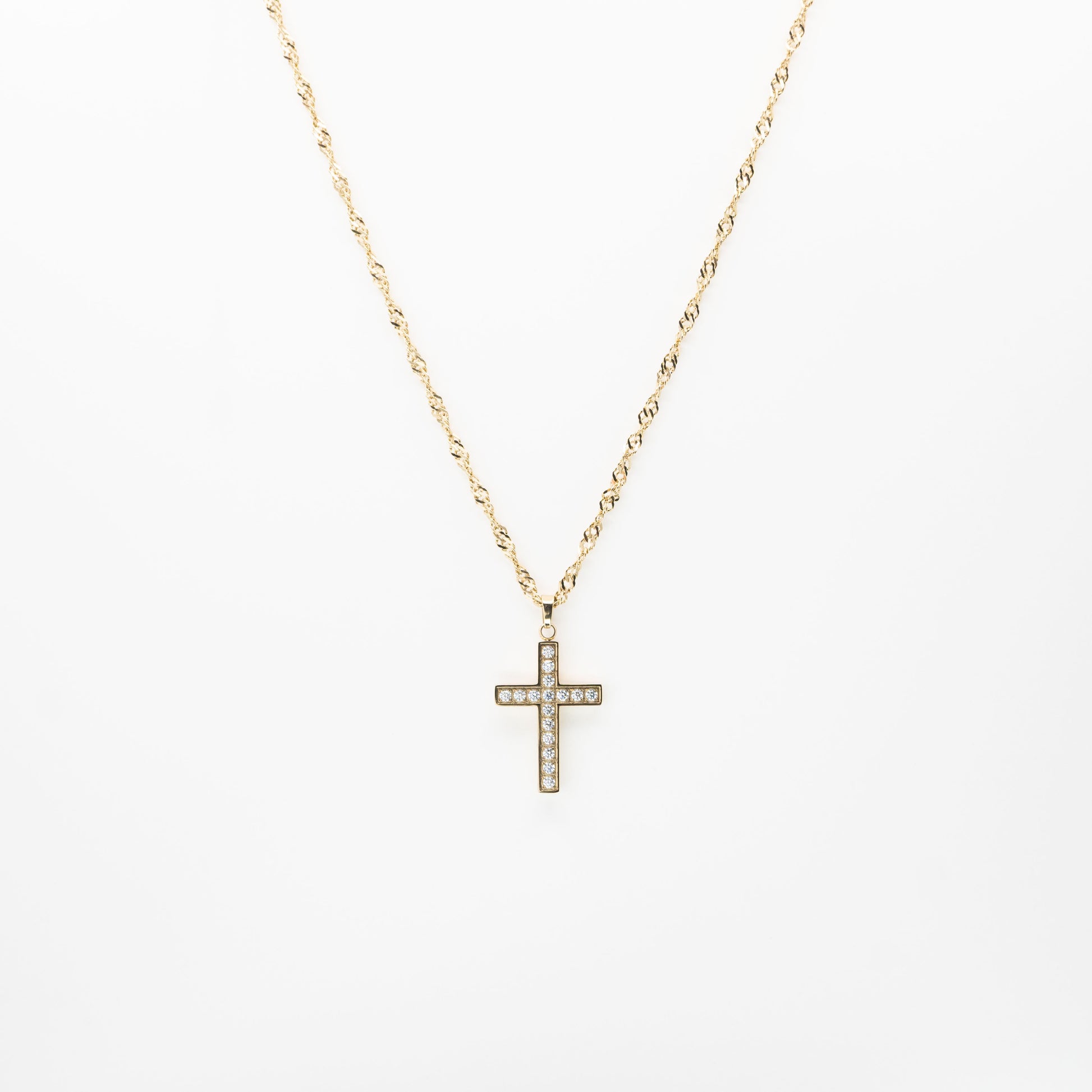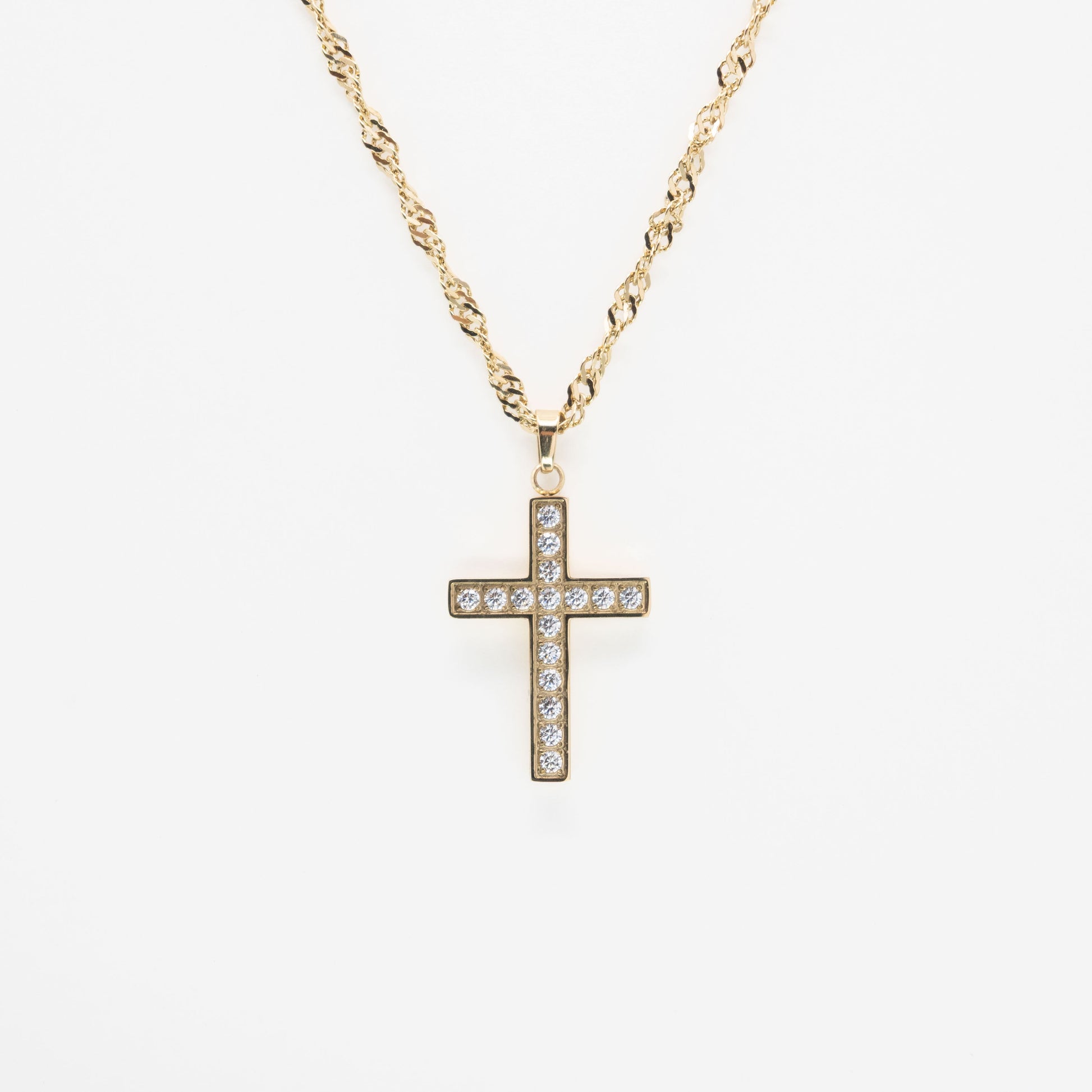 Collar de cadena dorada con dije de cruz con strass blanco.