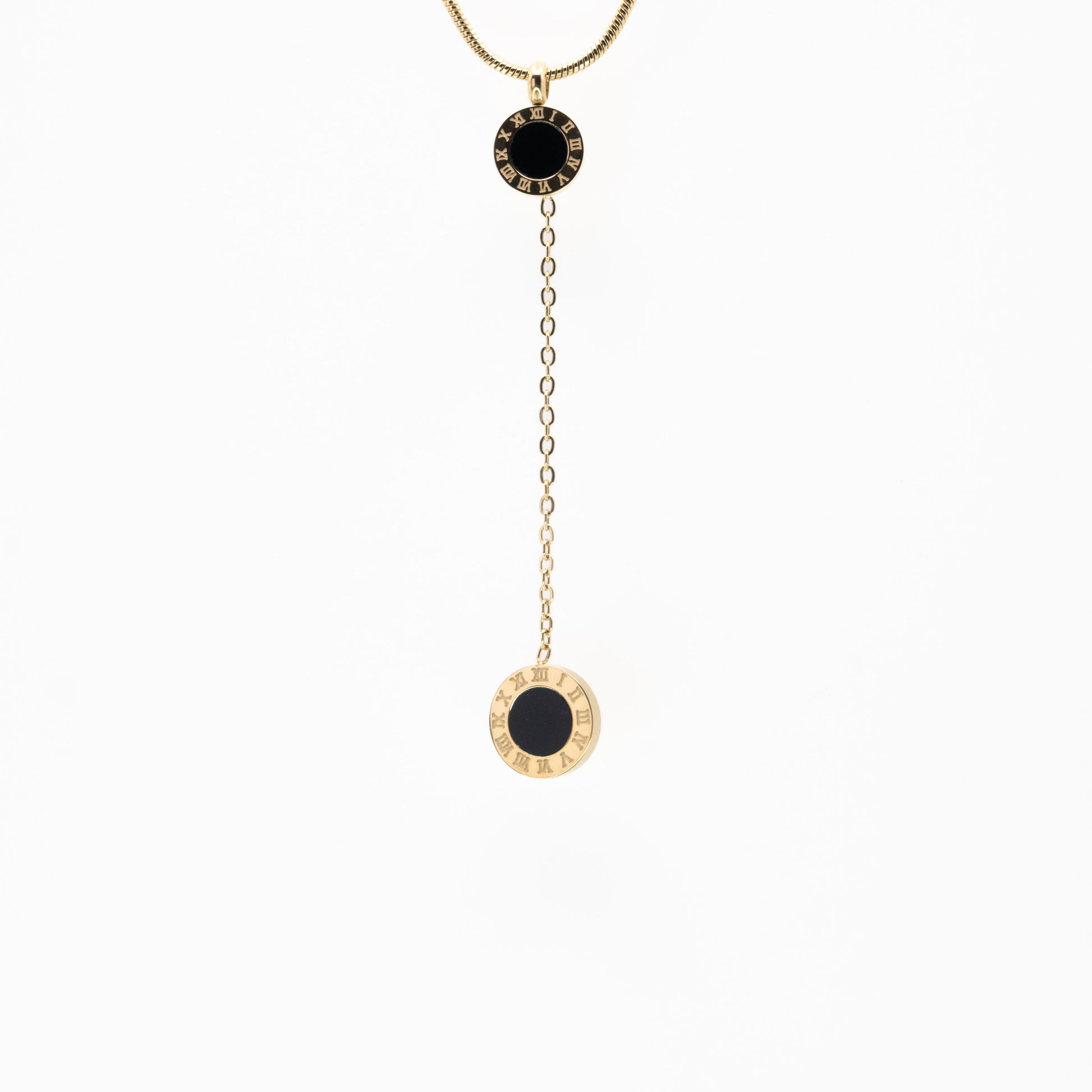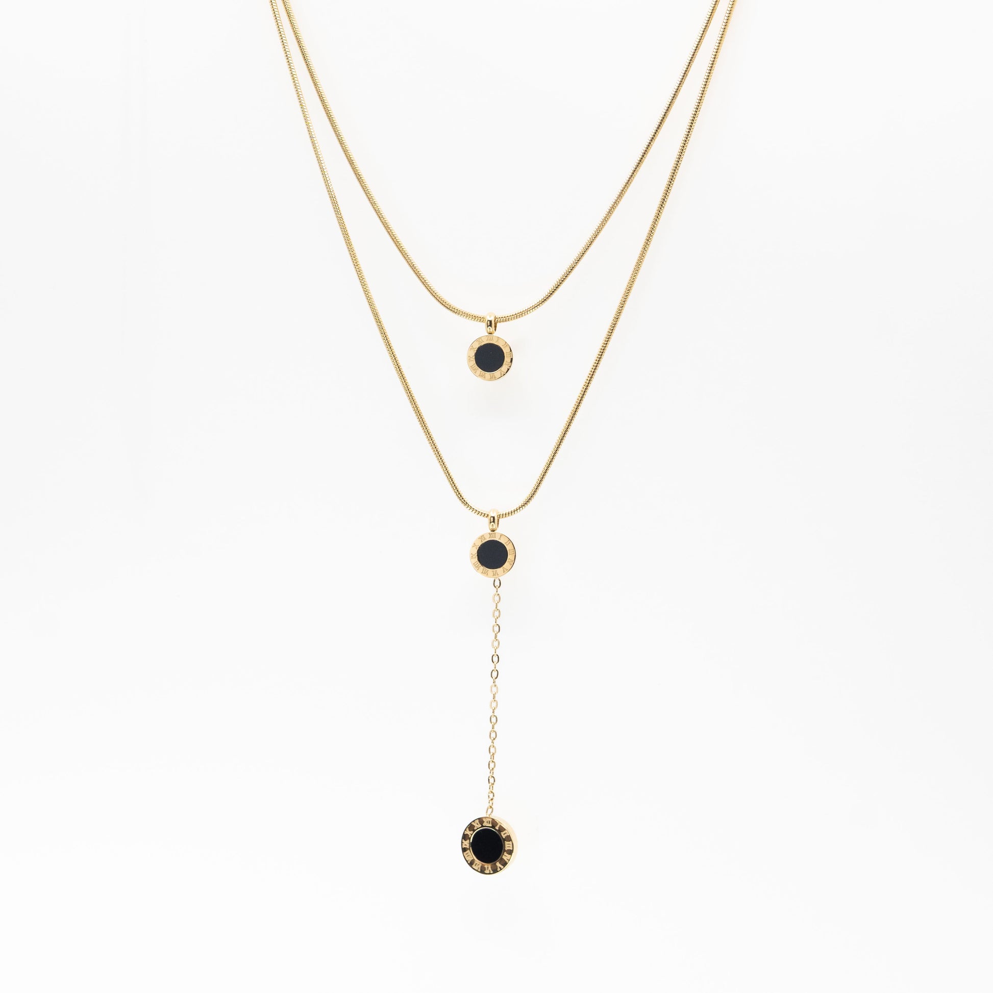 Collar de multicadena dorado con dijes de relojes con centro de acrílico negro.
