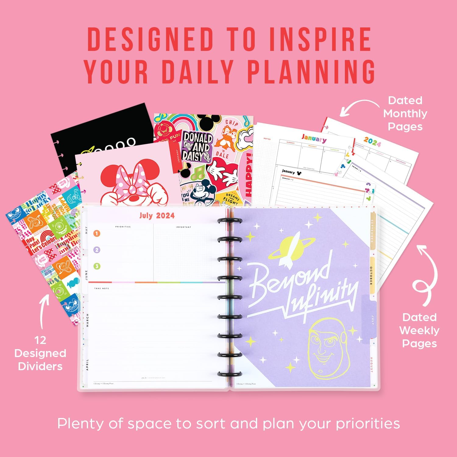 - Estilo: esta bonita agenda de Disney 2024 incluye 12 meses de calendarios y hojas semanales y 12 divisores con personajes de Disney y Pixar, diseños vibrantes y mensajes positivos. Las resistentes cubiertas laminadas protegen las páginas, y el sistema encuadernado en disco y los discos de plástico te permiten personalizar el planificador con accesorios.