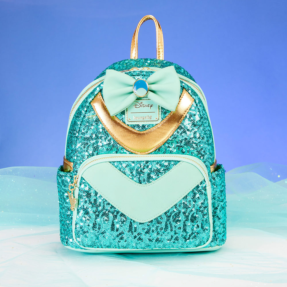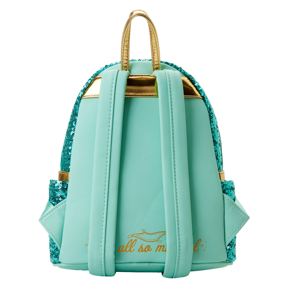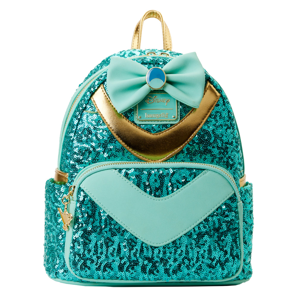 ¡Encabeza tu lista de deseos con un lazo brillante! La minimochila de lentejuelas Loungefly Disney Princess Jasmine es "muy mágica". Lánzate a un mundo completamente nuevo con un estilo natural con esta impresionante mochila, diseñada como el vestido de la princesa Jasmine. En la parte superior, reina un lazo 3D, con un amuleto de esmalte en el centro, cubierto por una cúpula de epoxi. Los toques de apliques de metal dorado y las lentejuelas azules dan vida al vestido de la princesa Jasmine. El bolsillo delantero brinda espacio adicional, y un colgante con cremallera de lámpara dorada mantiene la magia en secreto, lista para cuando quieras liberarla. En el reverso, impreso en dorado, “It’s all so magic” sirve de inspiración. Es el accesorio perfecto para tener a mano en un paseo en alfombra mágica o para convertir las salidas diarias en aventuras mágicas.