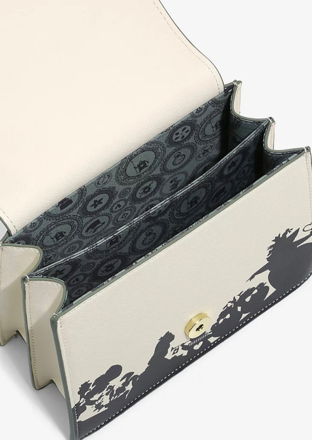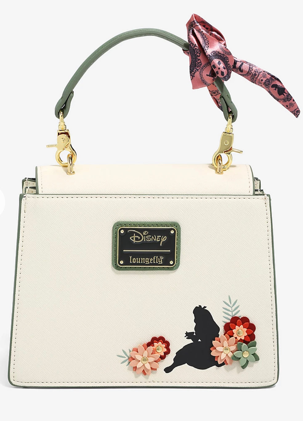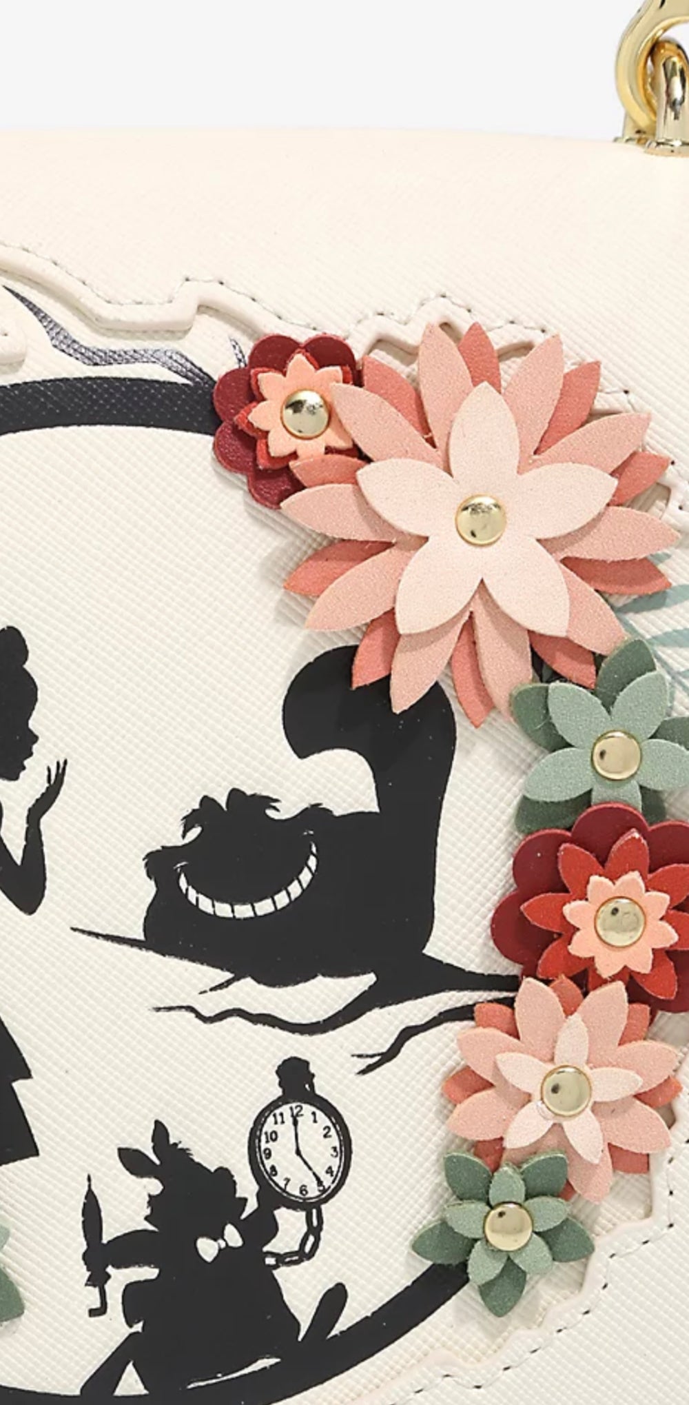 ¡Un atuendo completo no es nada sin un pequeño toque de locura del País de las Maravillas! Inspirado en Alicia en el país de las maravillas, este elegante bolso de Loungefly presenta un diseño frontal de las siluetas de Alicia, el gato de Cheshire y el Conejo blanco, con una rama de árbol en forma de media luna y aplicaciones de flores que rodean un borde troquelado.