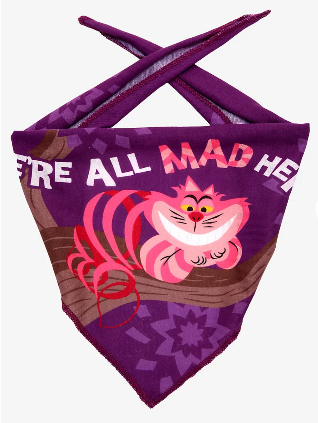 Al igual que el gato de Cheshire, la realidad de su perro o gato puede ser muy diferente a la suya: la hora del refrigerio, la hora de la siesta, repetir (o no tanto). Este pañuelo para mascotas presenta un diseño vibrante del curioso gato de Alicia en el país de las maravillas de Disney con su cita, "Estamos todos locos aquí".