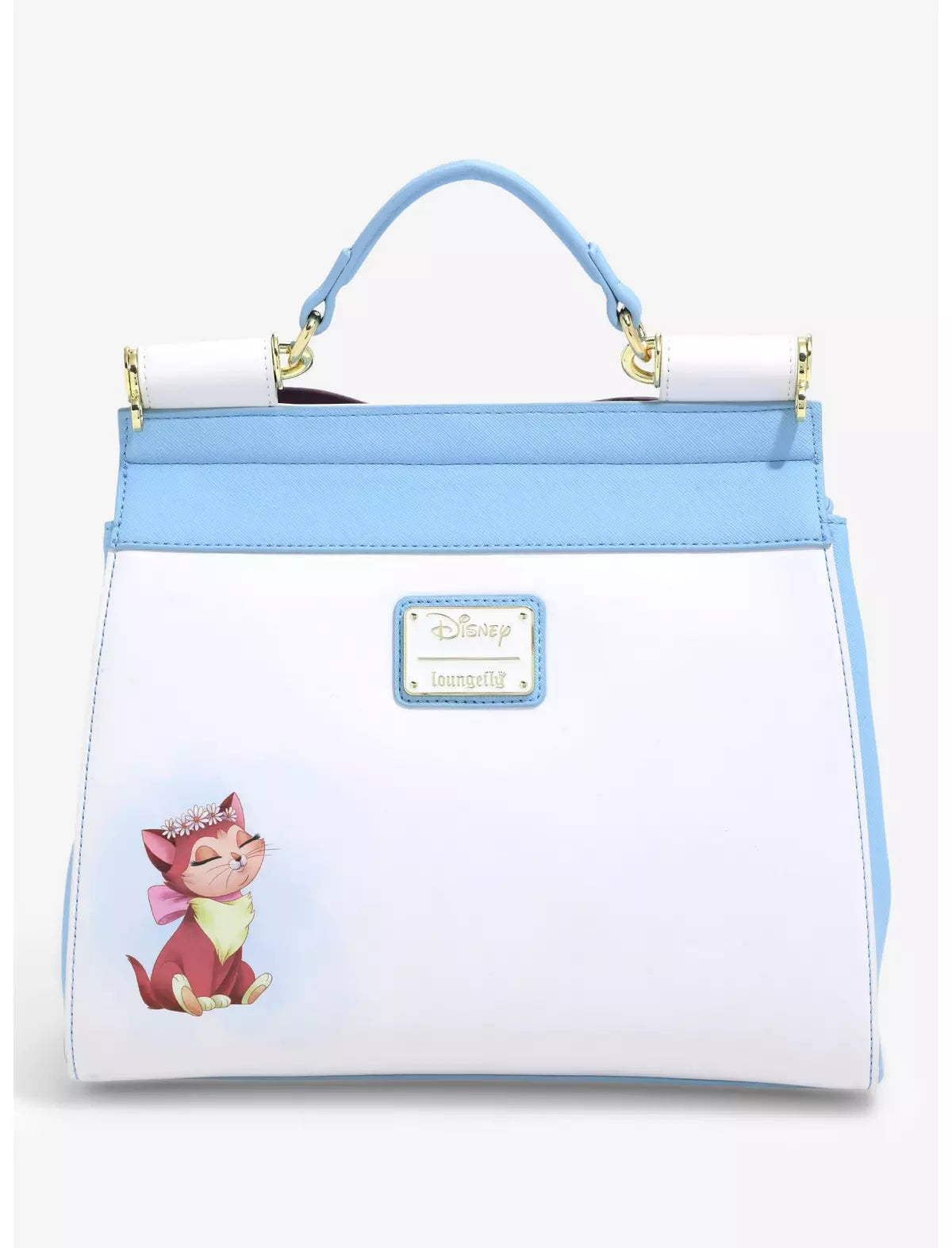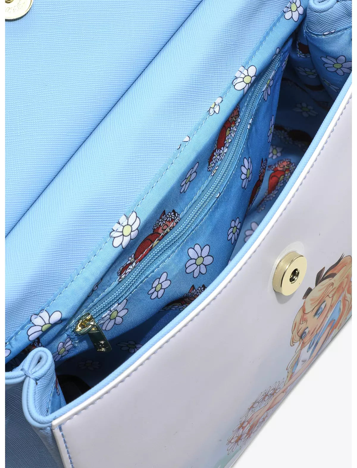 ¡Disfruta de la tarde dorada con este bolso de Alicia en el País de las Maravillas! Una Alicia ilustrada elabora una cadena de margaritas dentro de un campo de flores en el cuerpo azul pastel, mientras que flores troqueladas y un lazo en 3D adornan la solapa frontal. En el otro lado, su gata Dinah adopta una pose atrevida cerca de la placa con el nombre de Loungefly. ¡Una correa de hombro extraíble te permite tener las manos libres mientras caes en las madrigueras de los conejos, y el cierre magnético mantiene las galletas "Cómeme" seguras y protegidas!