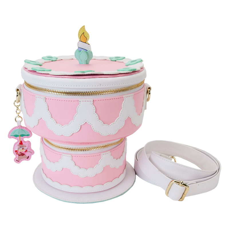 ¡Ponle la guinda a tu no cumpleaños con este bolso cruzado para pastel de Unbirthday de Alicia en el País de las Maravillas de Loungefly Disney! Añade diversión con un bolso totalmente figurativo. Este accesorio presenta dos capas o compartimentos circulares tipo “pastel” en color rosa para guardar tus pertenencias durante el día. El glaseado con apliques decora cada nivel. El nivel superior incluye apliques de flores "glaseadas" de color verde azulado claro y una vela aplicada que se eleva desde el centro. ¡En la oscuridad, la llama brilla! Un dije aplicado del Lirón de Disney remata el look. ¡Conmemora tu no cumpleaños con estilo!
