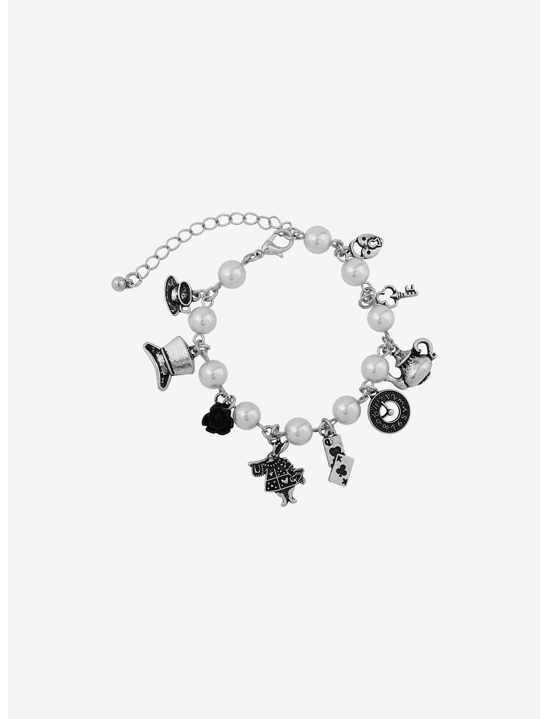 ¡No hay nada de loco en agregar esta pieza caprichosa a tu colección de joyas! Complemente su atuendo para la fiesta del té con esta pulsera con dijes, que tiene dijes de conejo blanco, naipes, tetera y reloj de bolsillo, separados por perlas de imitación.