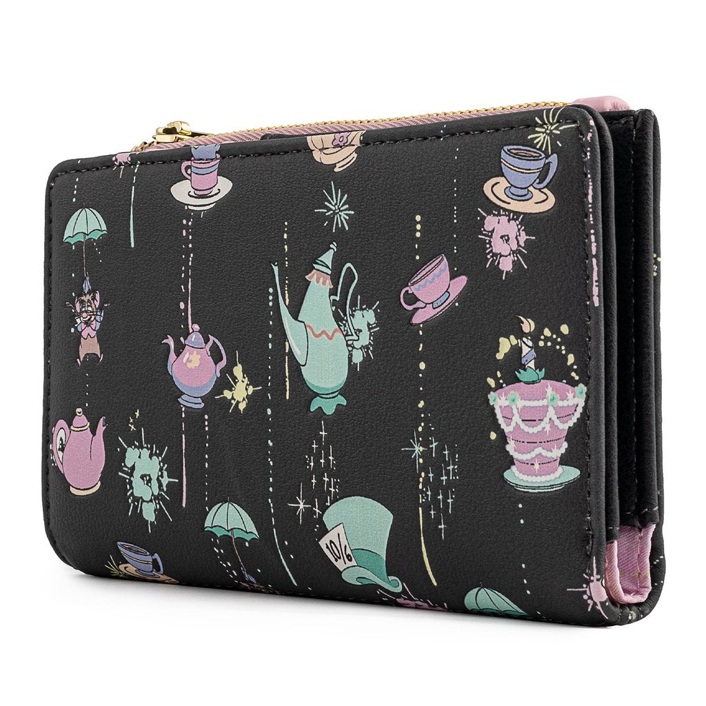 La cartera con solapa A Very Merry Unbirthday to You de Disney Alicia en el país de las maravillas está hecha de cuero vegano (poliuretano). La billetera se cierra a presión, tiene un bolsillo con cremallera y herrajes metálicos resistentes, y cuenta con: colgante de cremallera esmaltado, detalles impresos y en relieve. Tome nota del patrón de coordinación de la tela del forro interior.