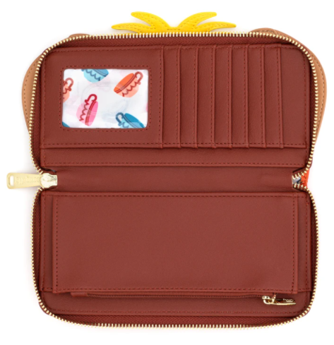 Esta cartera de piel sintética incluye apliques, bordados y detalles de placa de metal. Echa un vistazo al revestimiento interior de la taza de té.