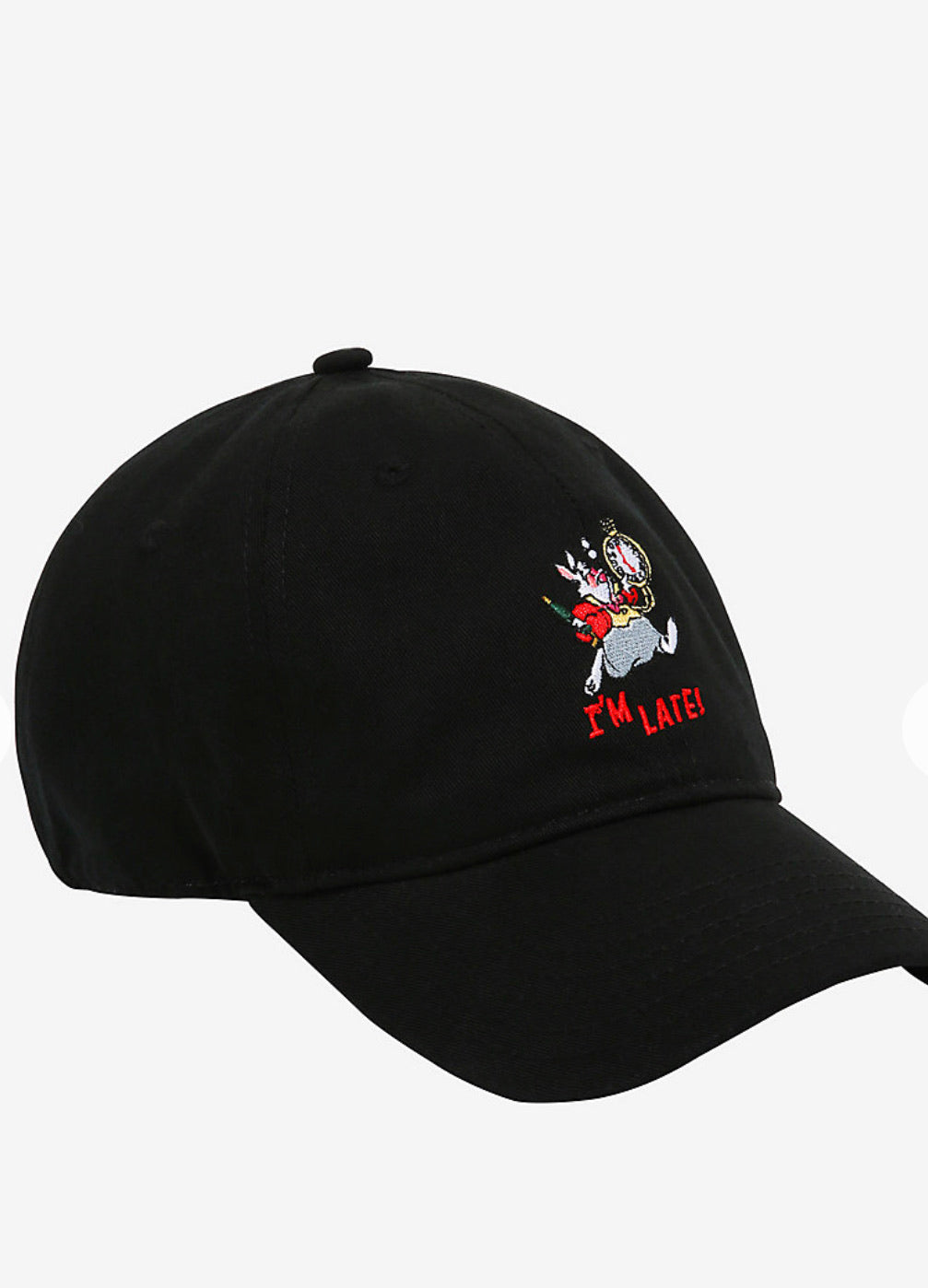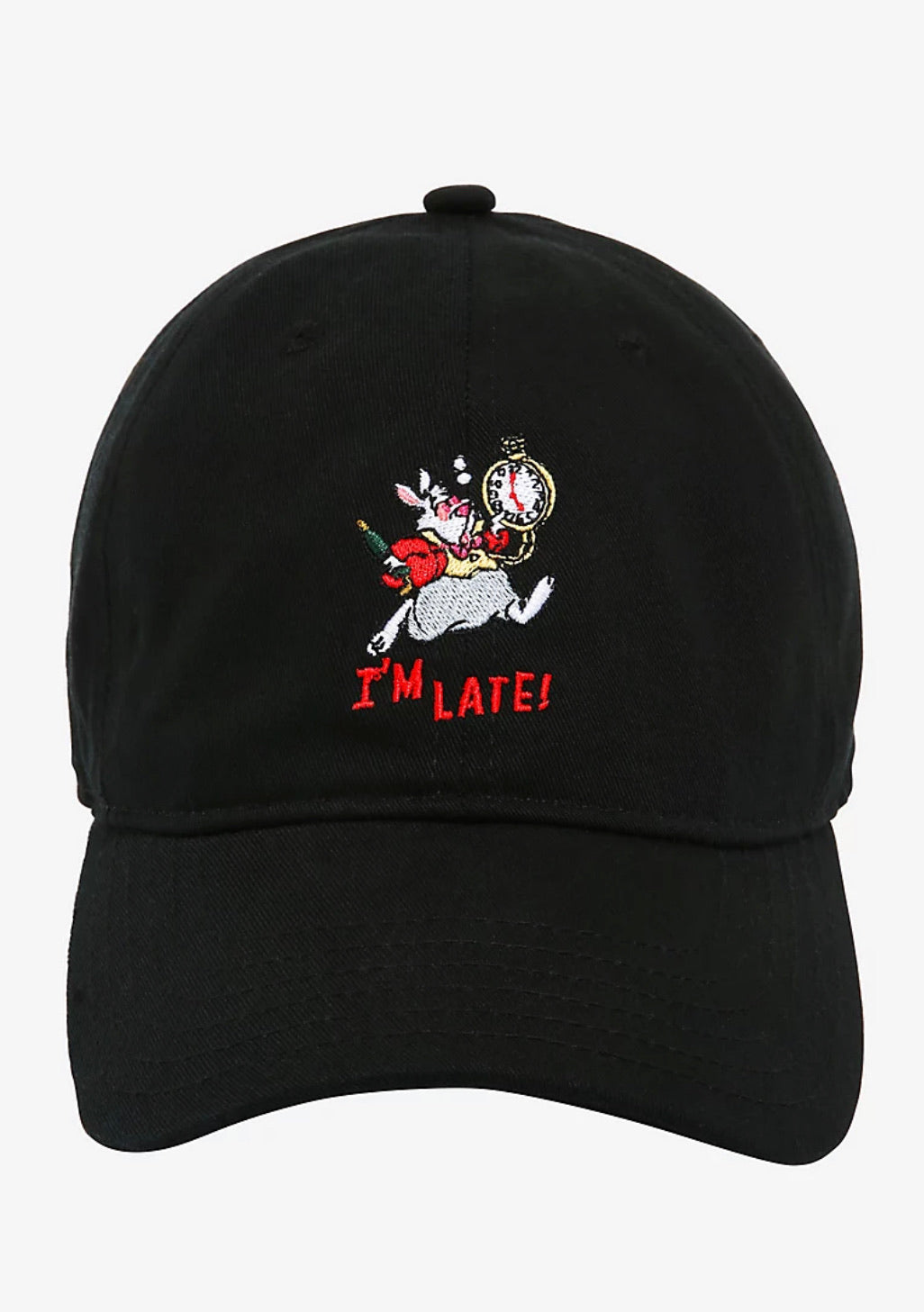 El conejo blanco de Alicia en el país de las maravillas de Disney está bordado encima de "¡LLEGO TARDE!" letras en la parte delantera y un cierre deslizante ajustable se presenta en la parte posterior.