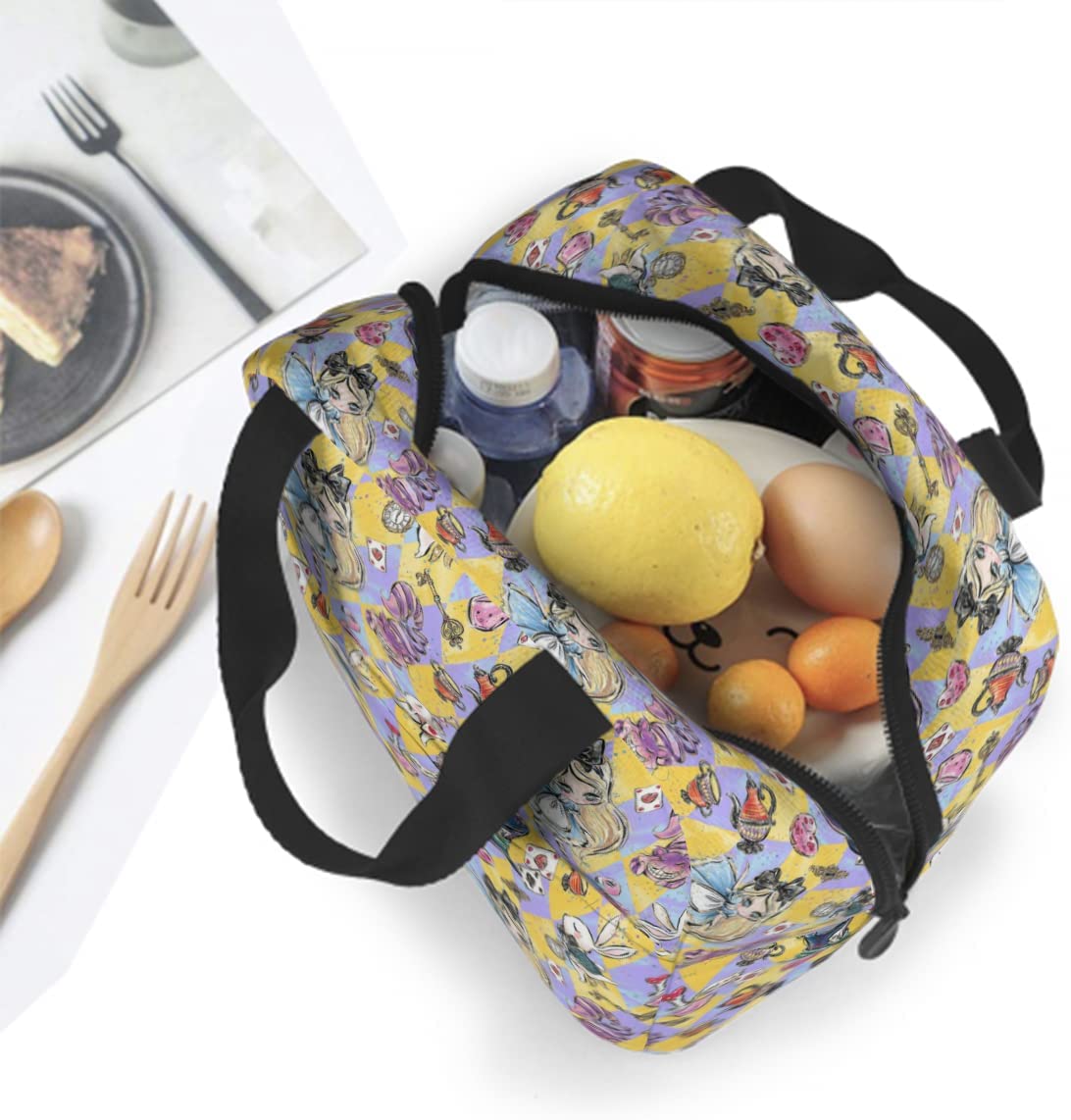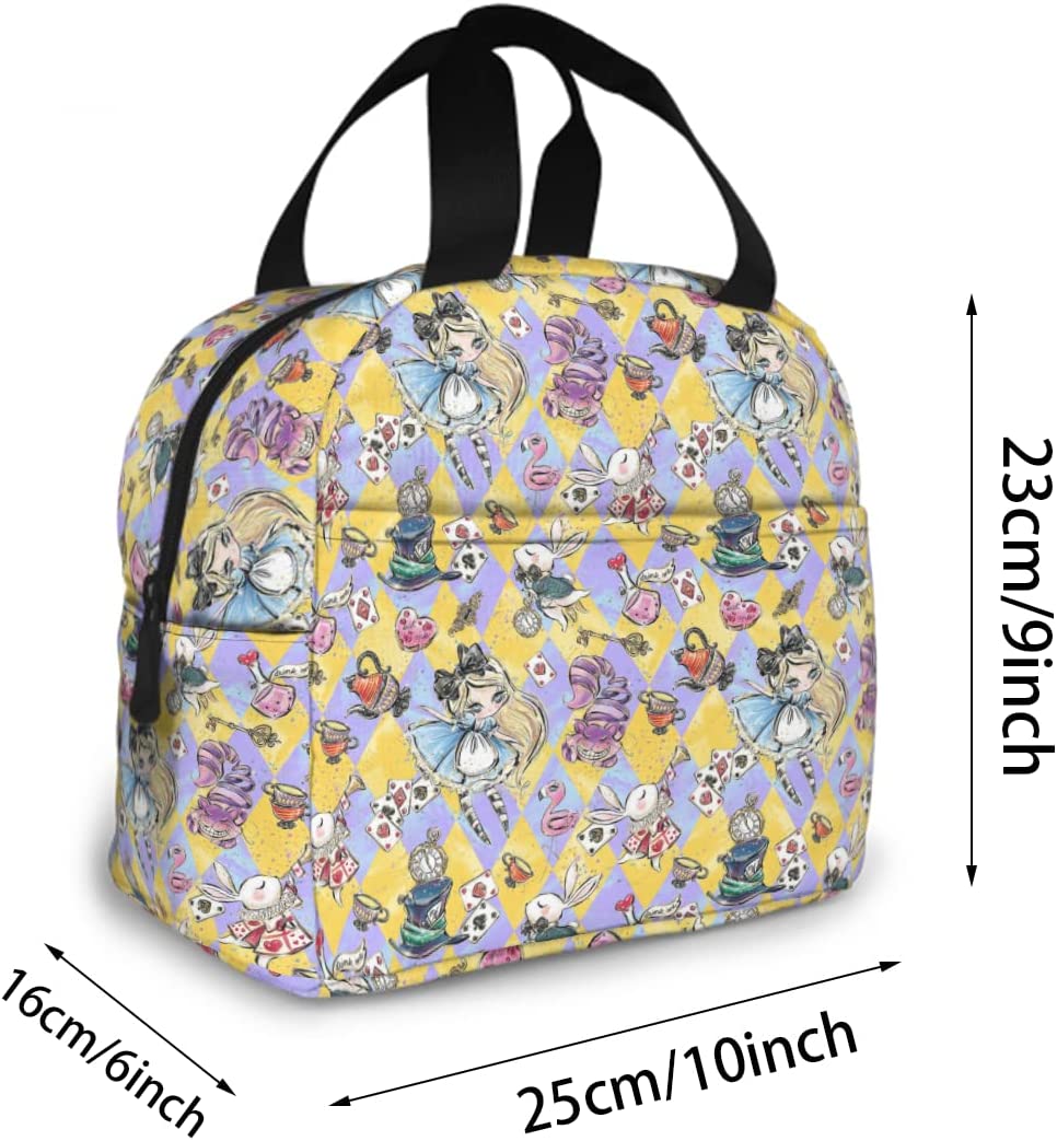 - Diseño de impresión de marco completo: la bolsa de almuerzo temática Alice Wonderland está diseñada con impresión de imagen completa, y el patrón temático único está diseñado por diseñadores profesionales. Esta hermosa bolsa de almuerzo se ve diferente de otras bolsas de almuerzo ordinarias, puedes reconocerla de un vistazo.