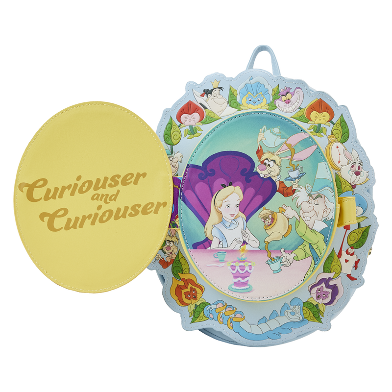 La mochila Loungefly Disney Alice in Wonderland Cameo Mini está hecha de cuero vegano (poliuretano). La bolsa tiene correas ajustables para los hombros, bolsillos laterales y herrajes de metal dorado brillante. Las características adicionales incluyen apliques, grabados y detalles impresos. Tome nota del forro interior a juego.
