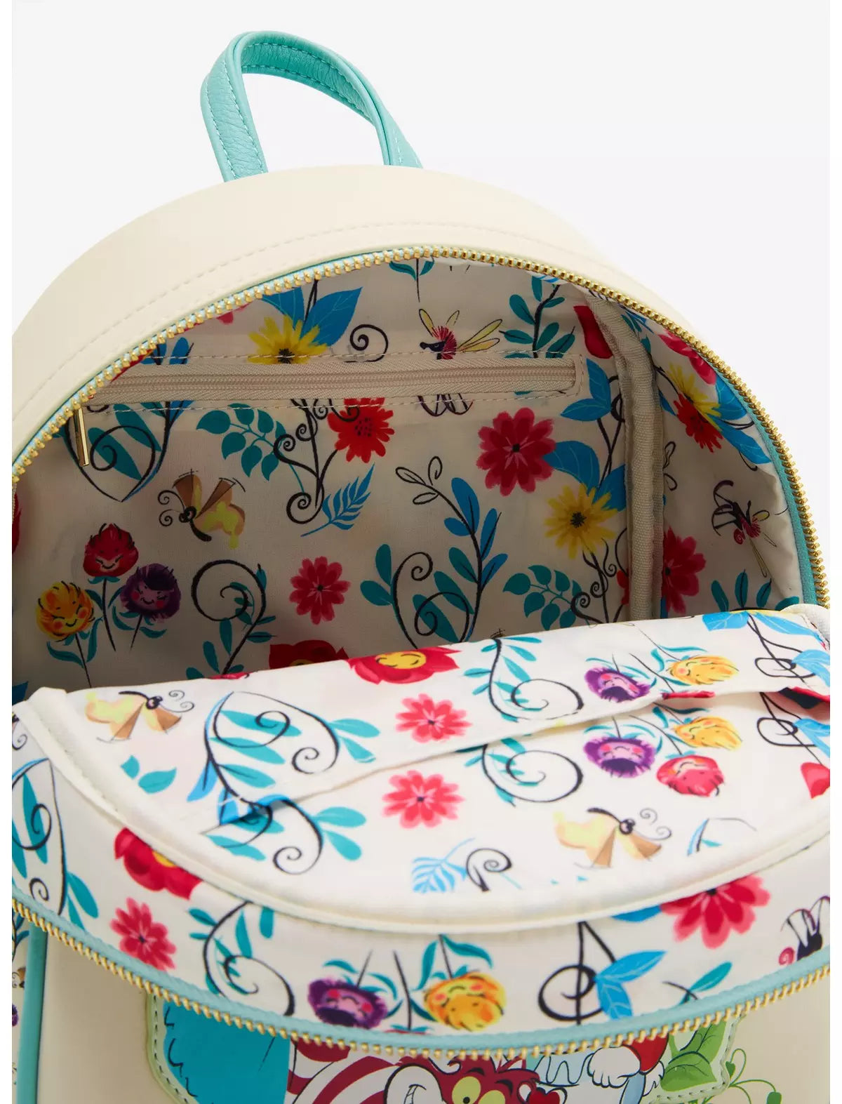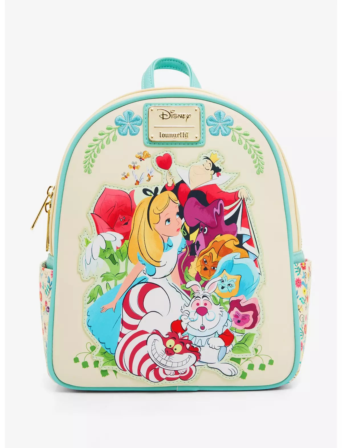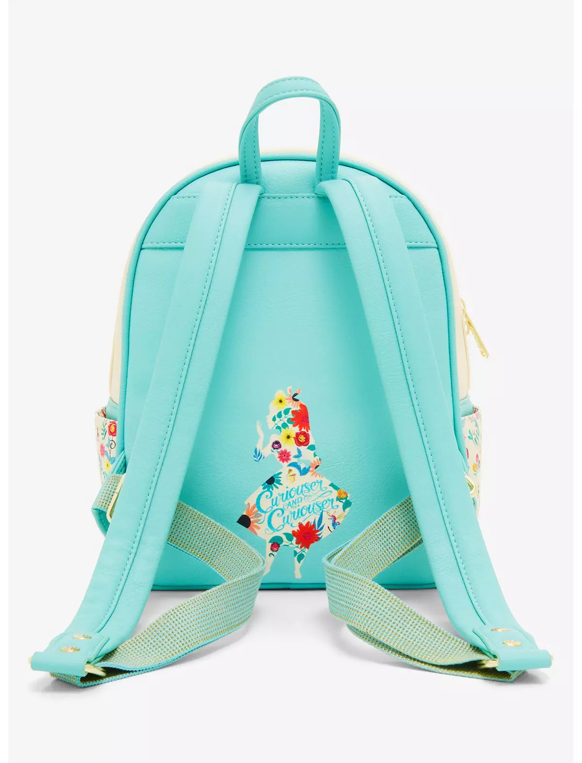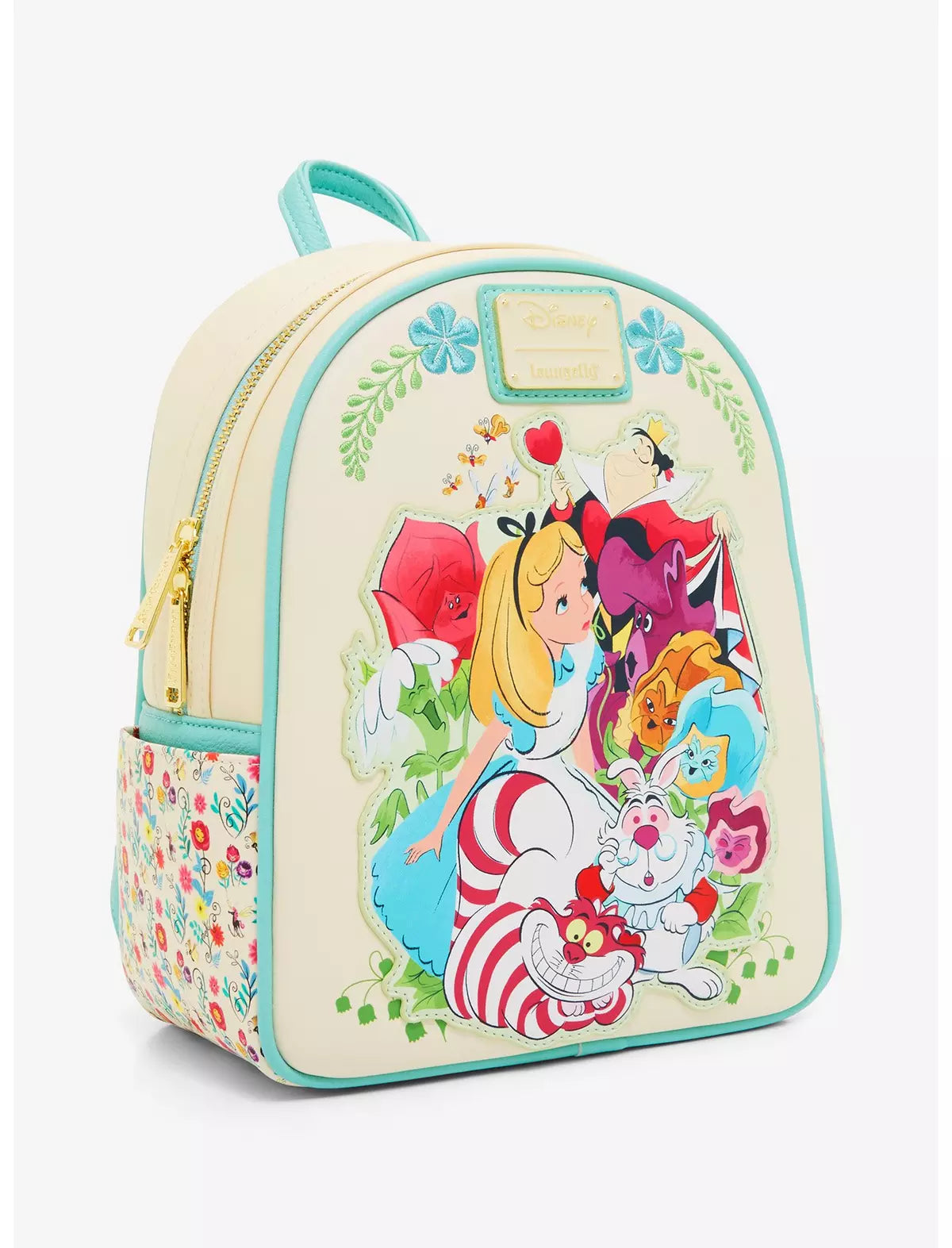 ¡Prepárate para una cita muy importante con esta mini mochila inspirada en Alicia en el País de las Maravillas! Con un aplique de Alicia con la Reina de Corazones, el Gato de Cheshire, el Conejo Blanco y las flores cantantes en el frente, la parte posterior incluye un retrato de silueta floral de Alicia con las letras "Curiouser and Curiouser". Con bolsillos laterales florales, detalles bordados y correas ajustables, esta mochila es perfecta para los fanáticos de la película de Disney.