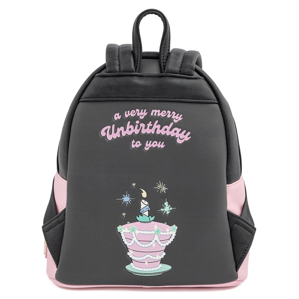 Celebre el 70 aniversario de Alicia en el país de las maravillas y un muy feliz no cumpleaños o tal vez una fiesta de té perfectamente loca con la mini mochila Disney Alicia en el país de las maravillas A Very Merry Unbirthday to You. Verás al Sombrerero Loco, El Lirón y la Liebre de Marzo sirviendo té mientras están sentados en una taza de té. Este bolso es perfecto para llevar tus necesidades mientras deambulas por el País de las Maravillas.\