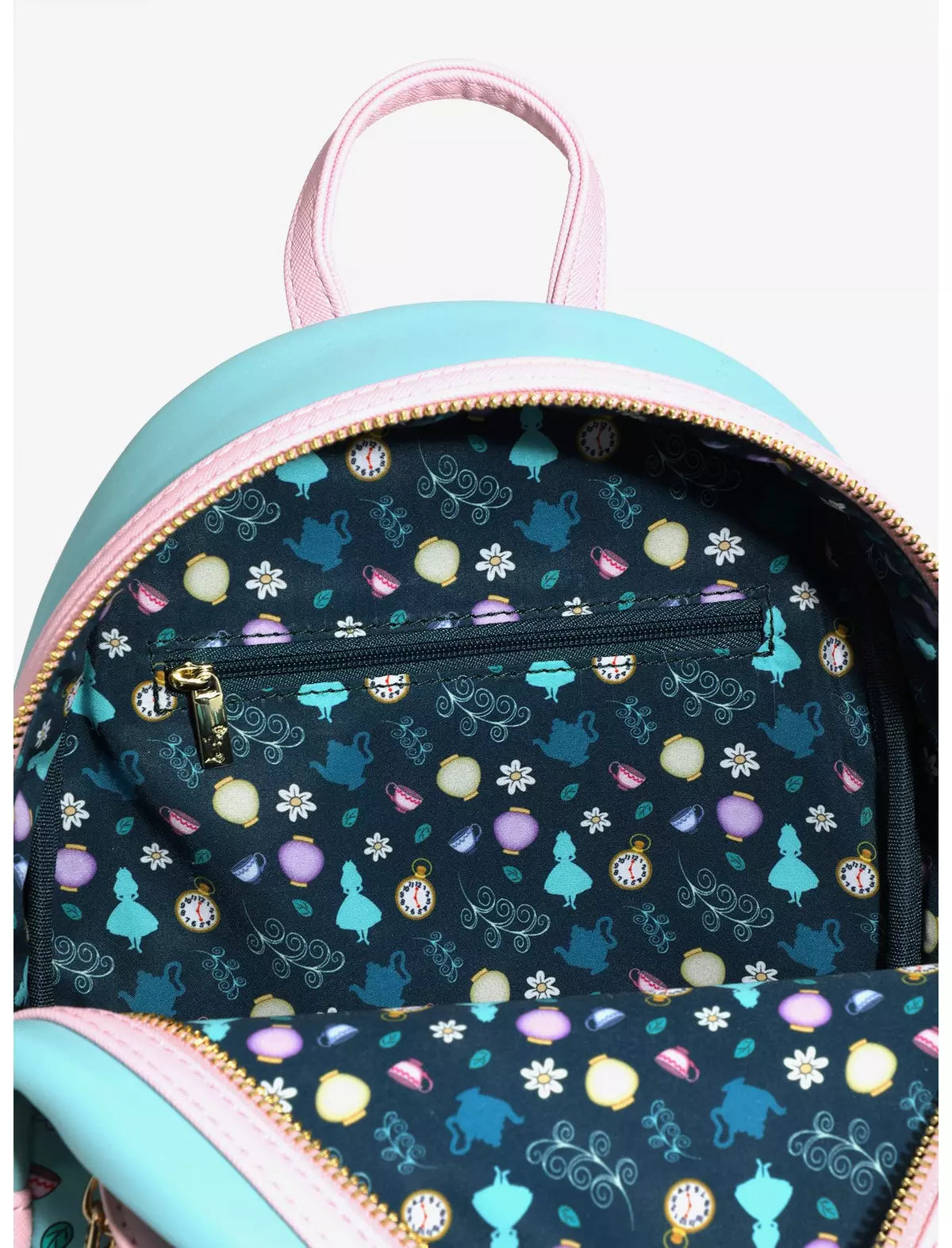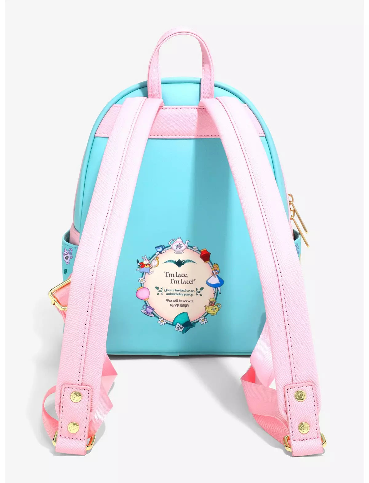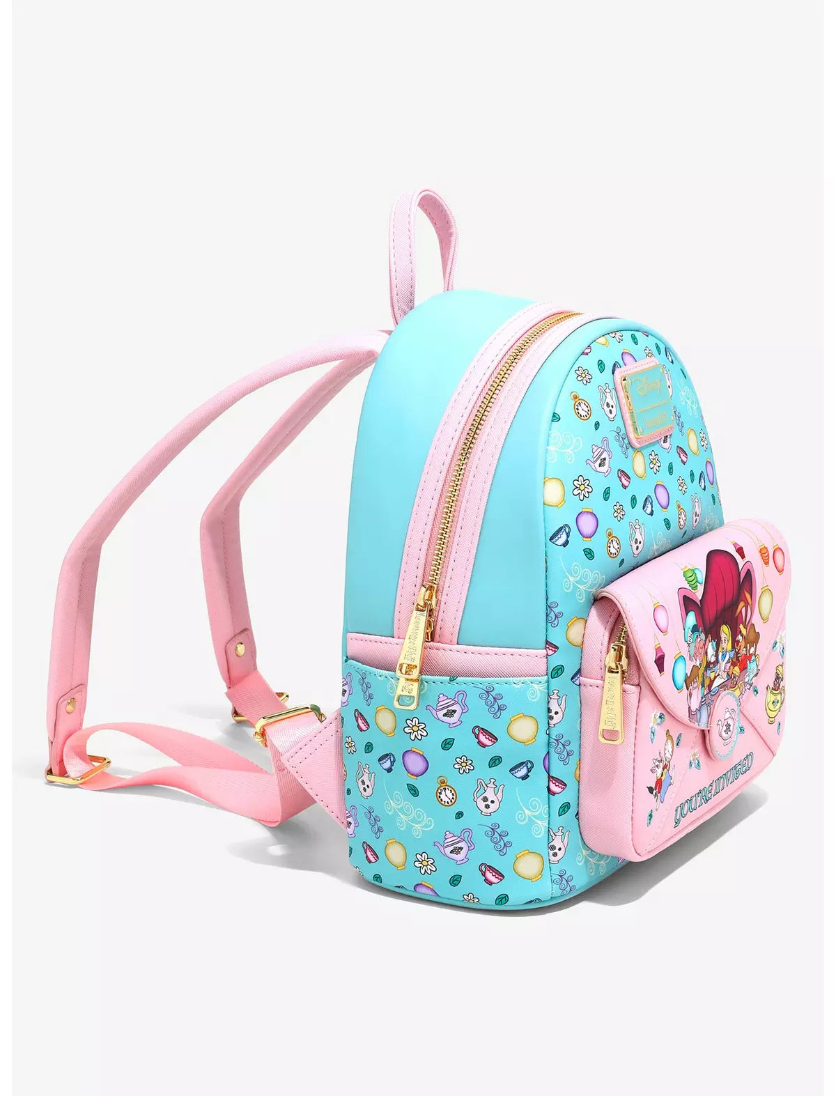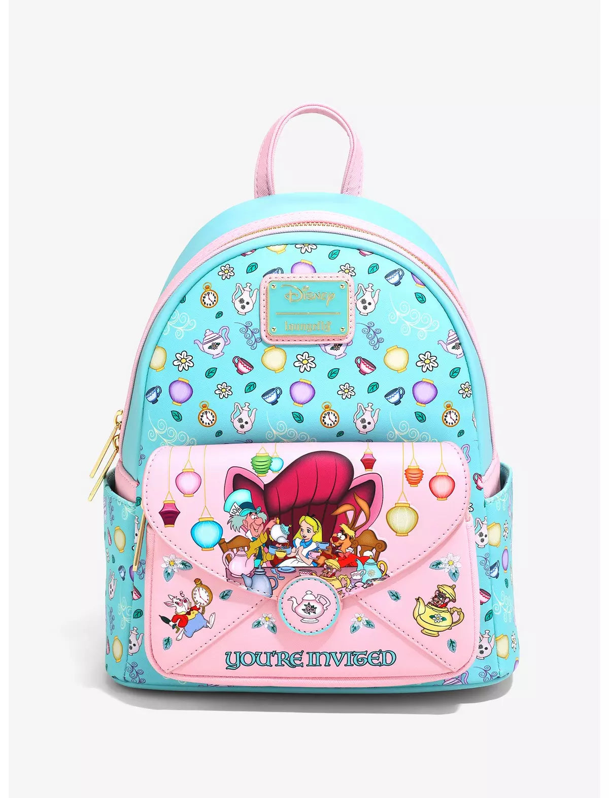 Aquí todos estamos enojados, ¡pero el Sombrerero Loco y la Liebre de Marzo parecen particularmente propensos a comportamientos estrafalarios! Esta mochila de Alicia en el País de las Maravillas está equipada con un bolsillo delantero tipo sobre rosa con una escena de Alicia y sus amigos del País de las Maravillas en la fiesta del té, letras "Estás invitado" y un cierre de tetera. El cuerpo y el interior grabados presentan un hermoso patrón de tazas de té, linternas y flores, ¡perfecto para tu próxima caída en el País de las Maravillas!
