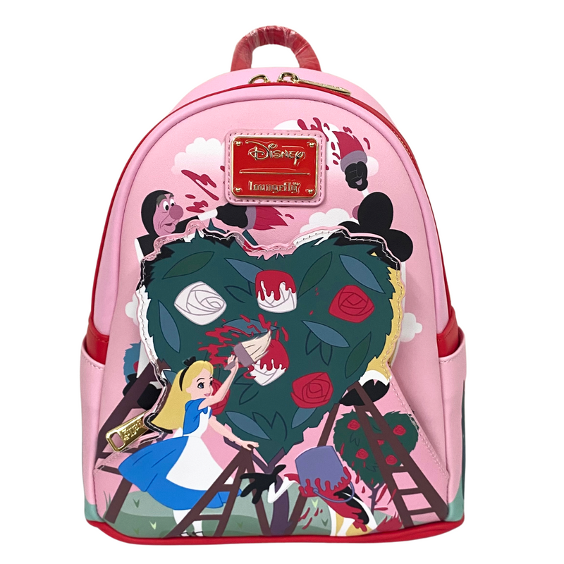 La minimochila roja Loungefly Disney Alicia en el país de las maravillas pintando rosas está hecha de cuero vegano (poliuretano). El bolso tiene correas ajustables para los hombros, herrajes metálicos resistentes, apliques y detalles impresos.