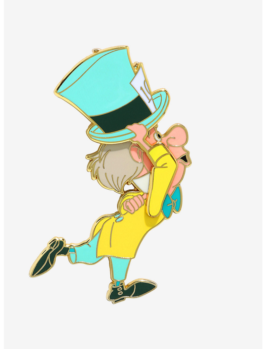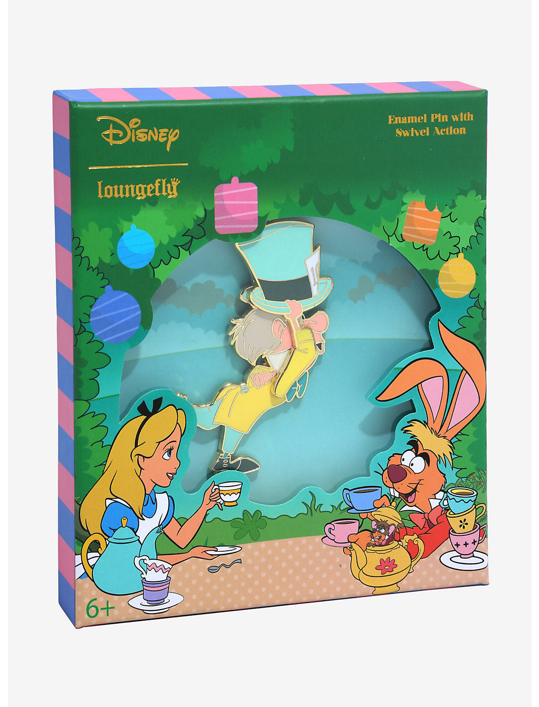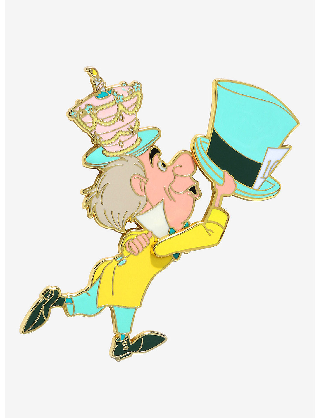 ¡Únete a una fiesta de no cumpleaños muy feliz con este alfiler de esmalte de Alicia en el país de las maravillas de Loungefly! El Sombrerero Loco está aquí para dar la bienvenida a cualquiera que desee entrar con la punta de su sombrero. ¡La acción giratoria revela un pastel de cumpleaños en su cabeza! Este alfiler es un complemento delicioso para su chaqueta, bolso o tablero de corcho.