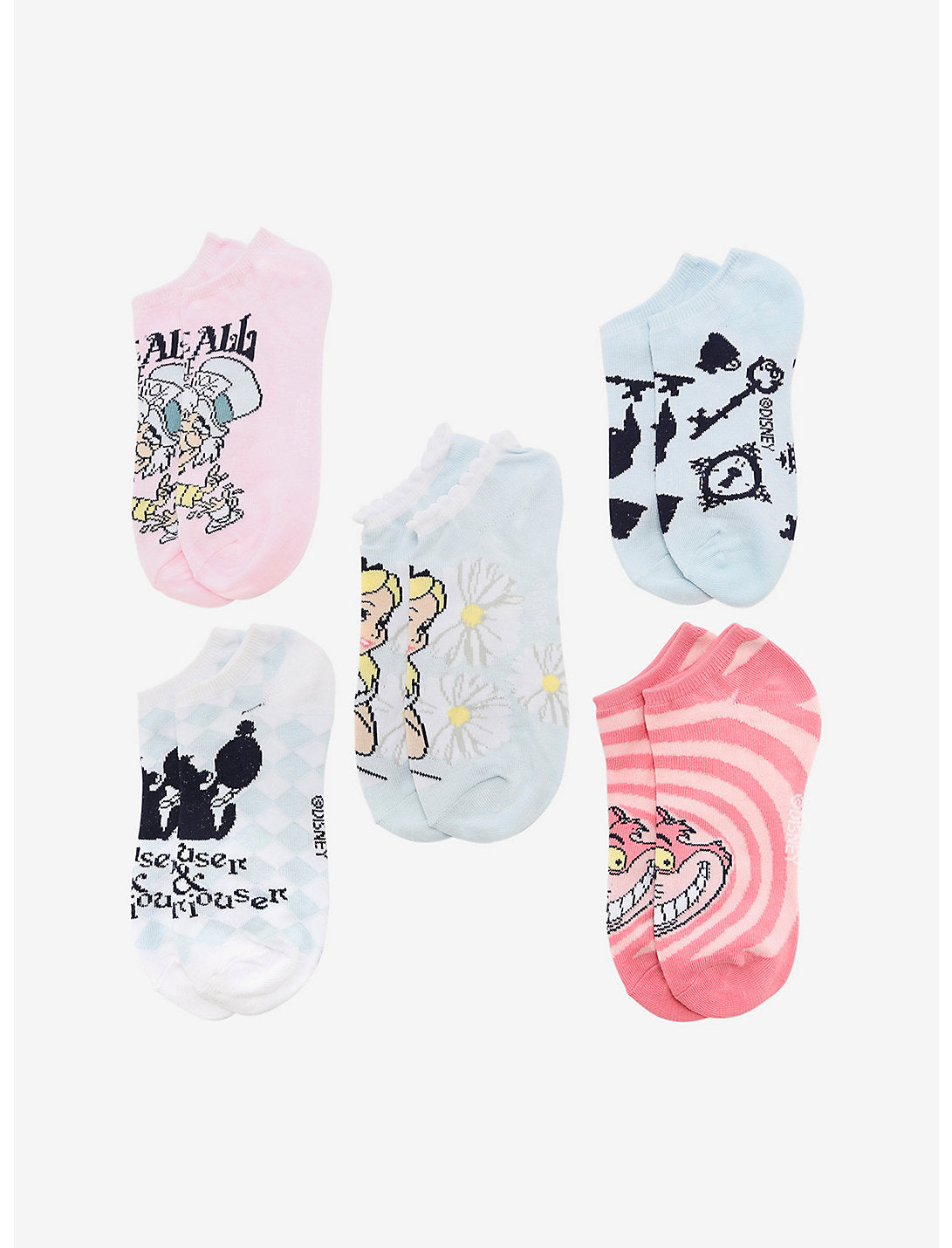 Atraviesa el país de las maravillas donde sea que estés con este conjunto de calcetines inspirado en el clásico animado de Disney Alicia en el país de las maravillas. ¡Crece "más y más curioso" con el conejo blanco, únete a la fiesta del té del Sombrerero Loco o simplemente sueña despierto entre las flores con Alice cuando te pongas estos suaves calcetines de tobillo!