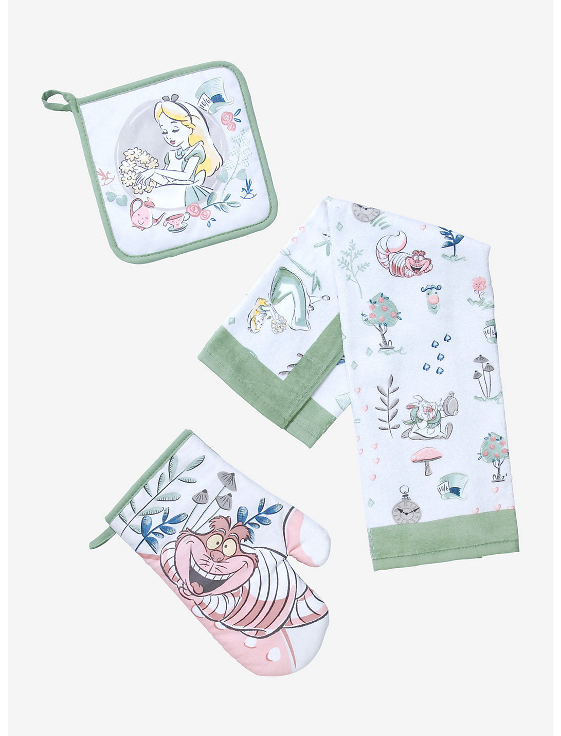 ¡Hornea delicias maravillosas para tu próxima fiesta de té en el País de las Maravillas con este juego de cocina de Disney! El gato de Cheshire ofrece su sonrisa característica en el guante de cocina, y Alice recoge flores en el agarraderas. El Conejo Blanco se apresura a su próximo evento sobre la toalla, ¡así que no lo detengas!