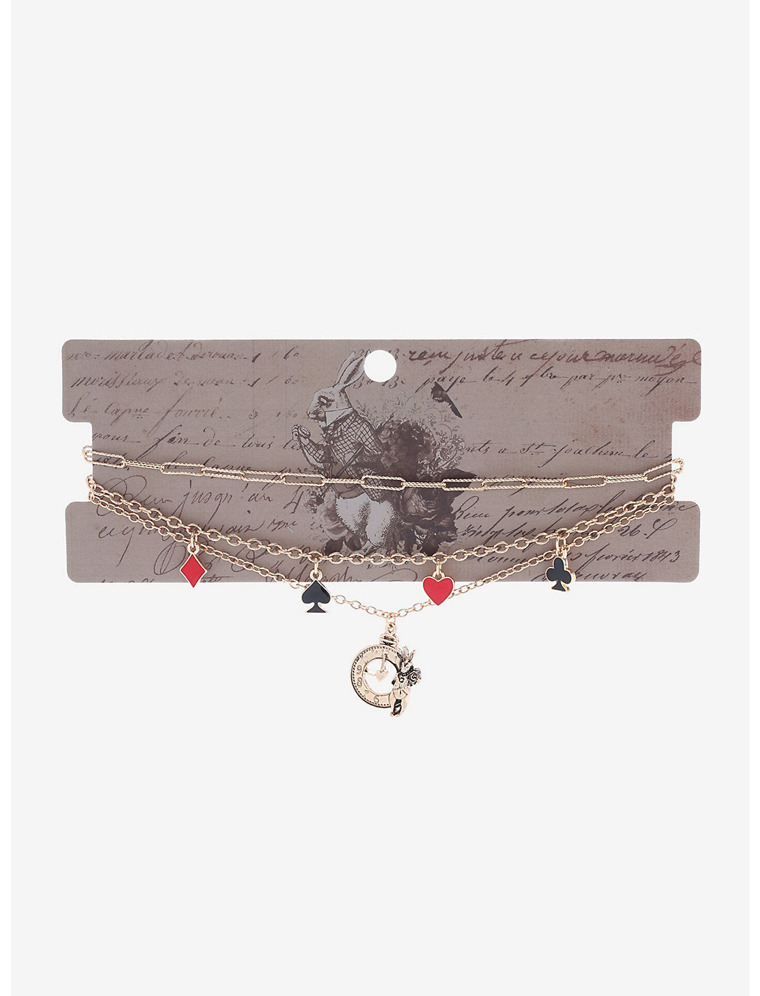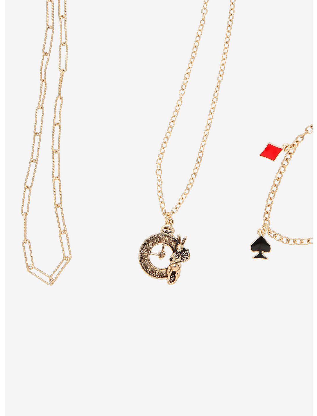 - Luce bien cuando llegues tarde a una cita importante con estos collares dorados que tienen traje de naipes y dijes de reloj con acento de conejo.