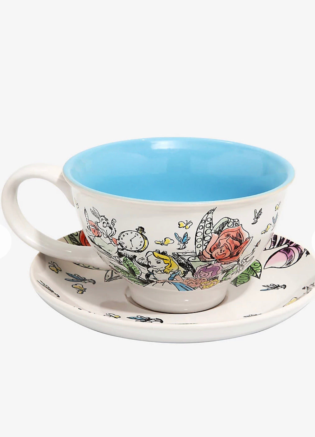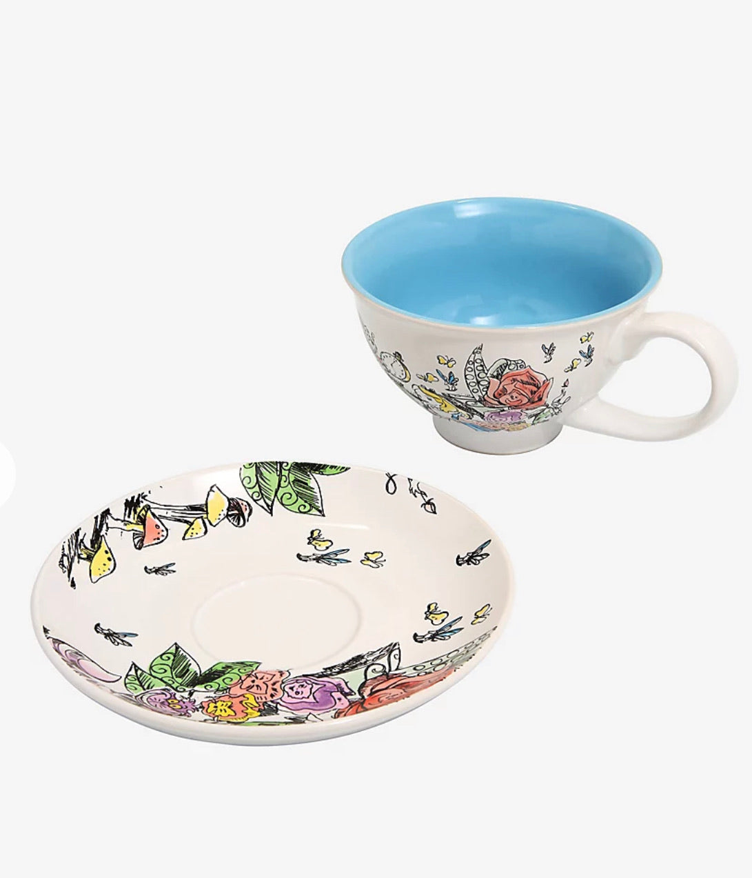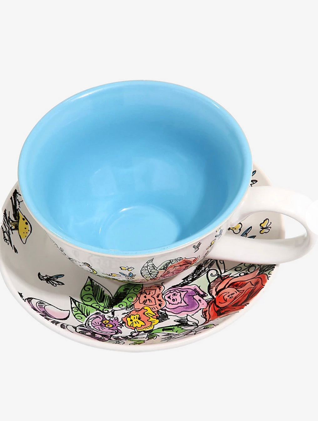 ¡Sírvete una deliciosa taza de té sin cumpleaños, 364 días del año con este juego de taza y platillo de Alicia en el país de las maravillas!