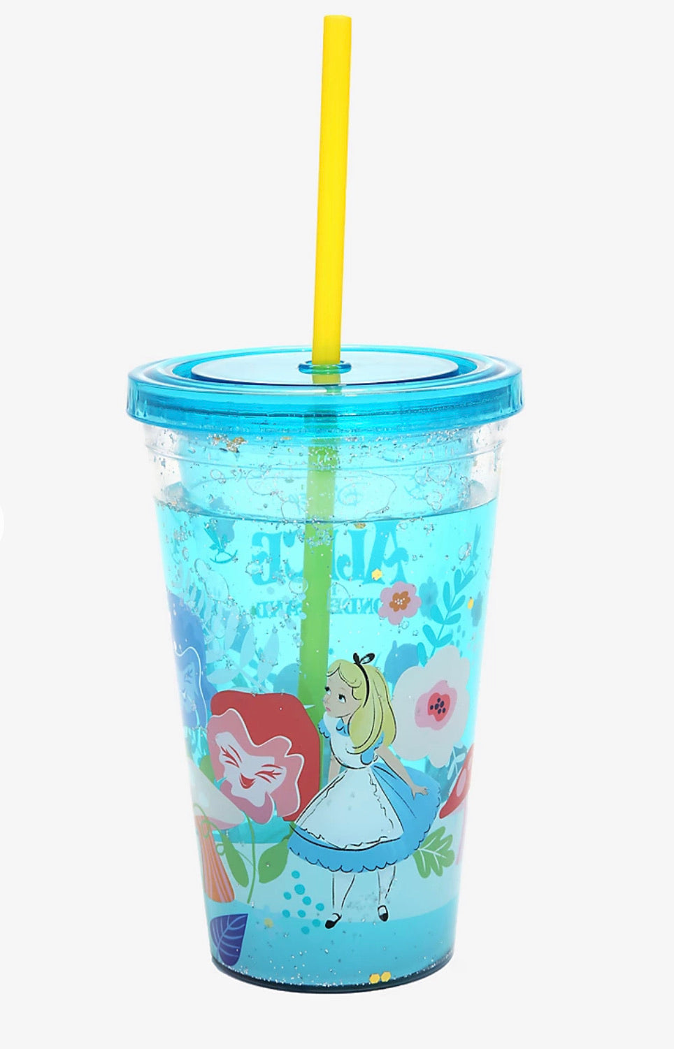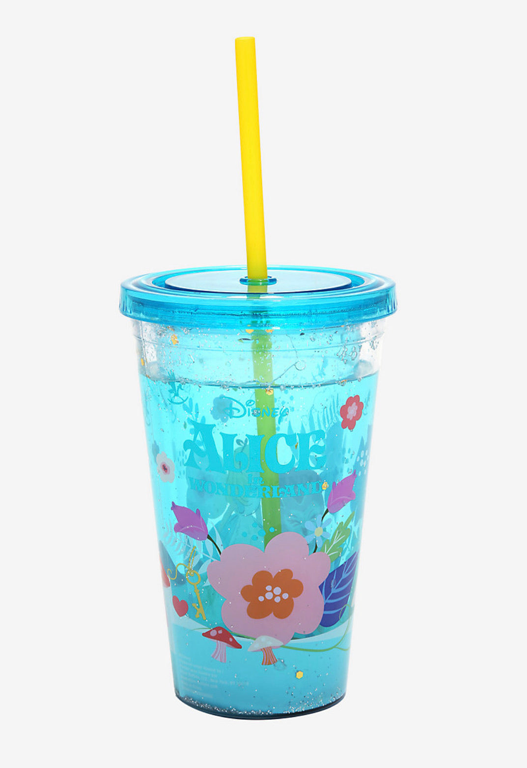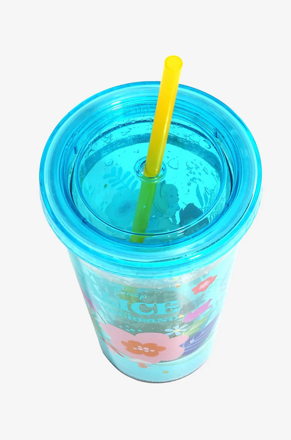 Con ilustraciones florales del clásico de Disney, esta taza azul transparente tiene una pajita reutilizable, tapa giratoria y un diseño de doble pared lleno de agua y purpurina flotante.