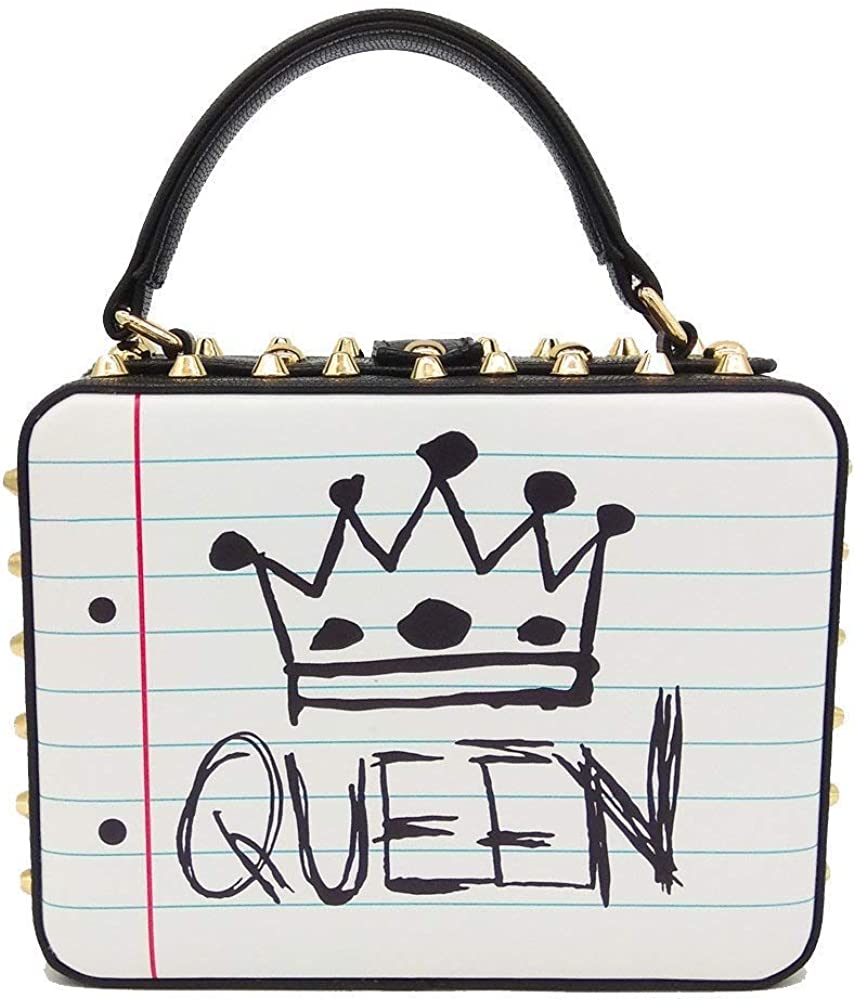 - Material y detalles: esta bolsa de hombro está hecha de remaches aplicados a mano en piel sintética de poliuretano. Parte delantera con impresión "All I Need Is Love and WIFI" y diamantes y remaches, parte trasera con estampado Queen & Crown y un patrón de sello antiguo. Forro de tela de algodón con un bolsillo interior para el teléfono. Un bloqueo de giro para el cierre