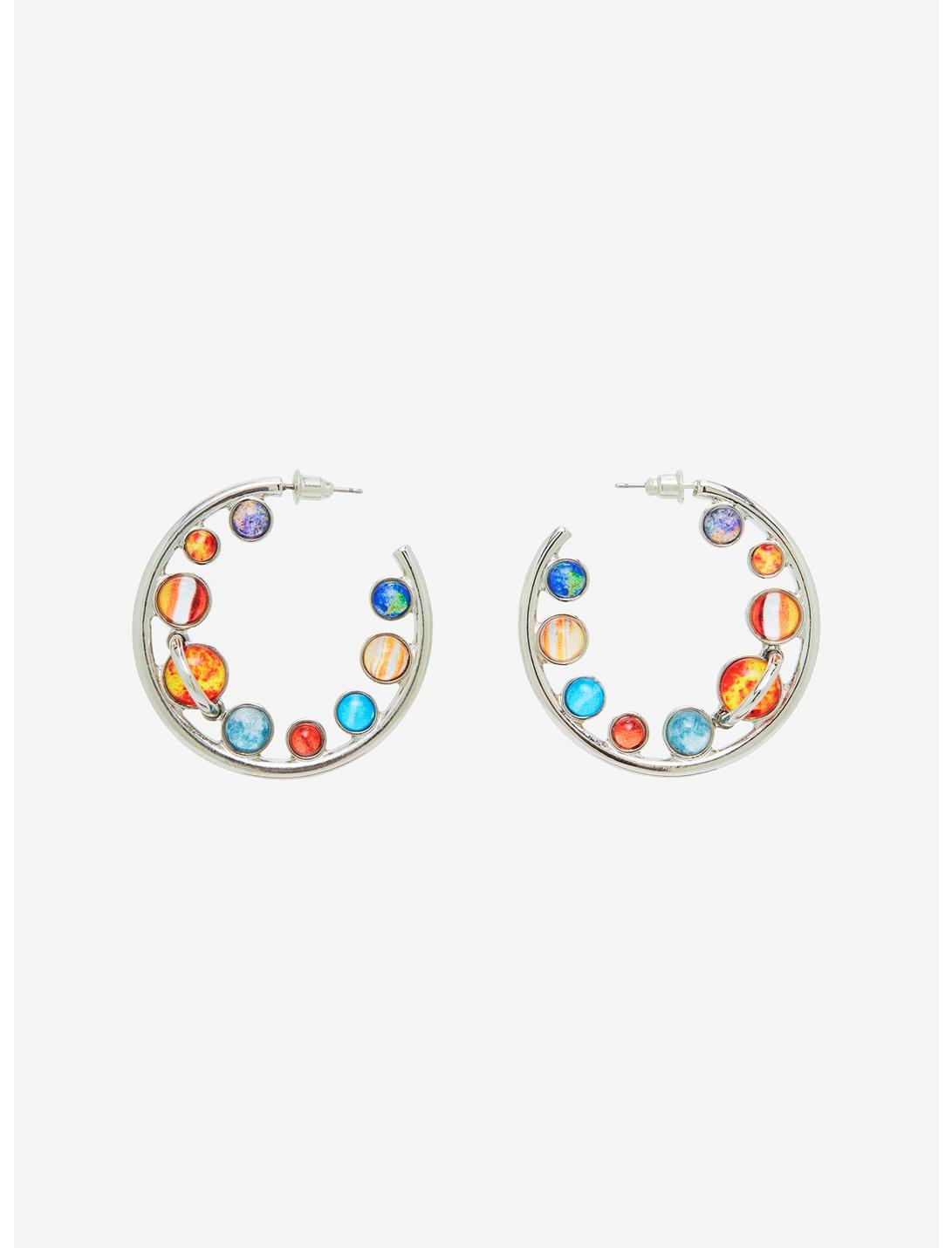 ¡Lleva tu mirada fuera de este mundo con unos aretes de aro llamativos! Este conjunto presenta aros en tono plateado con diferentes cuentas inspiradas en los planetas, todos alineados en el interior.