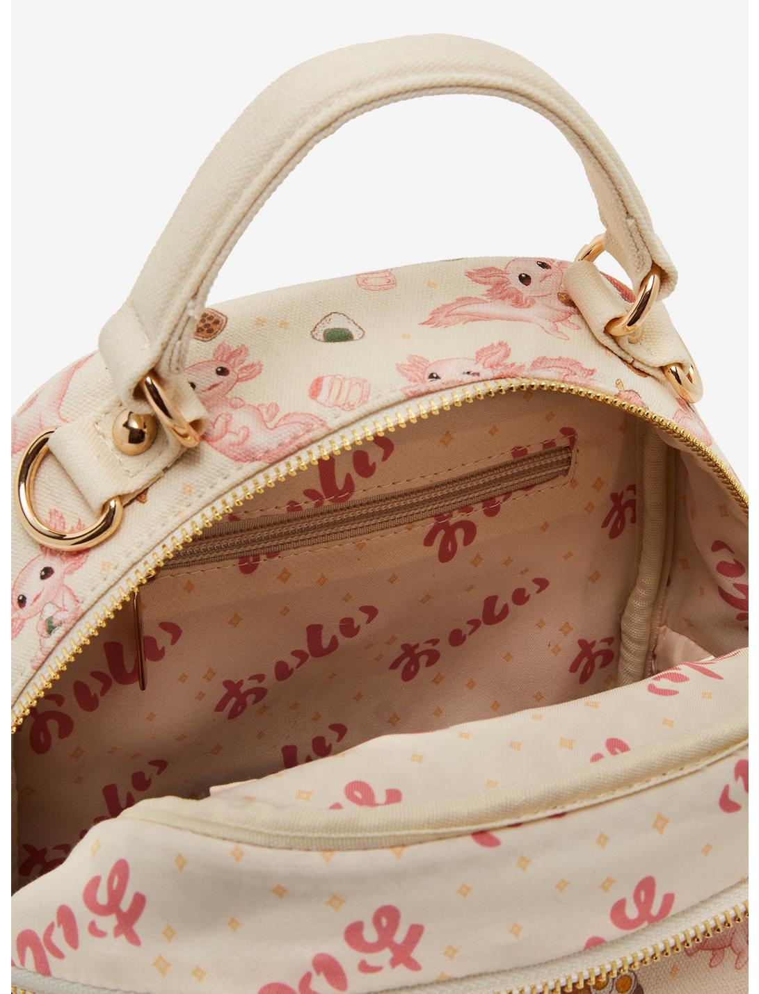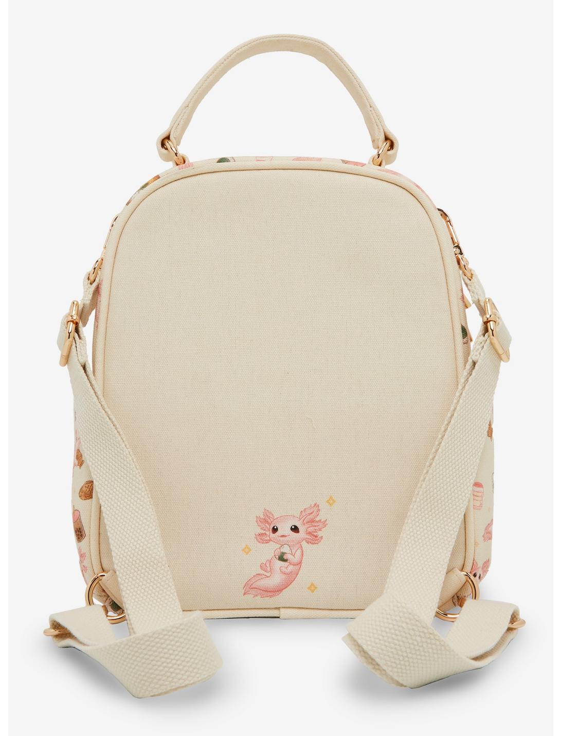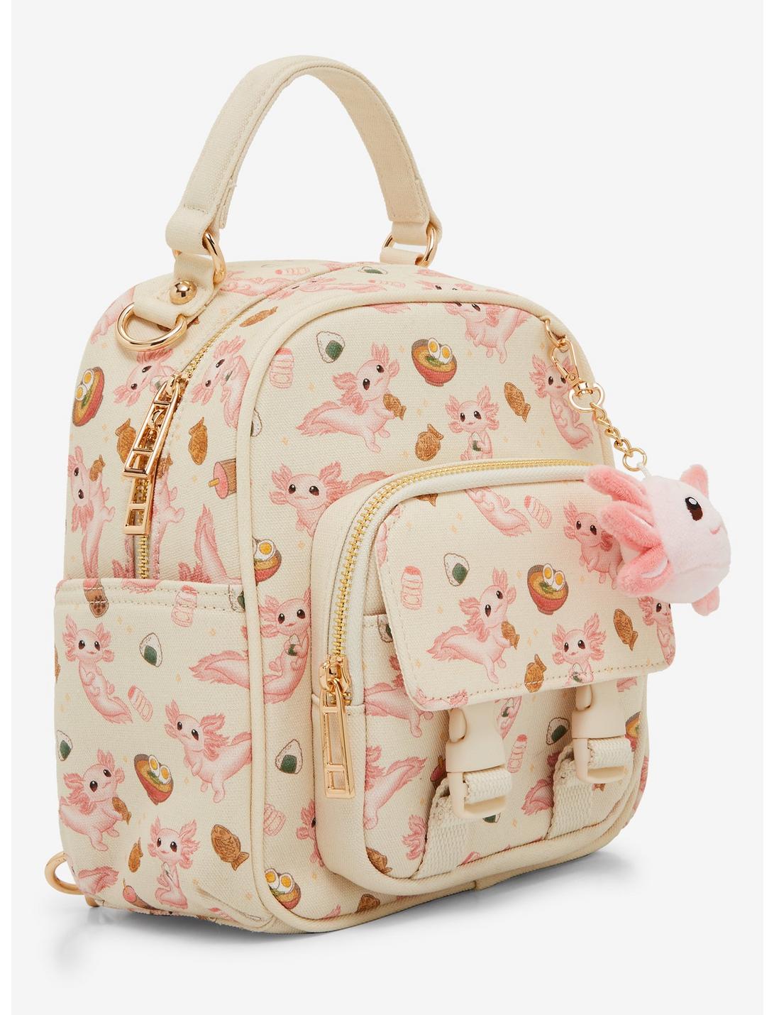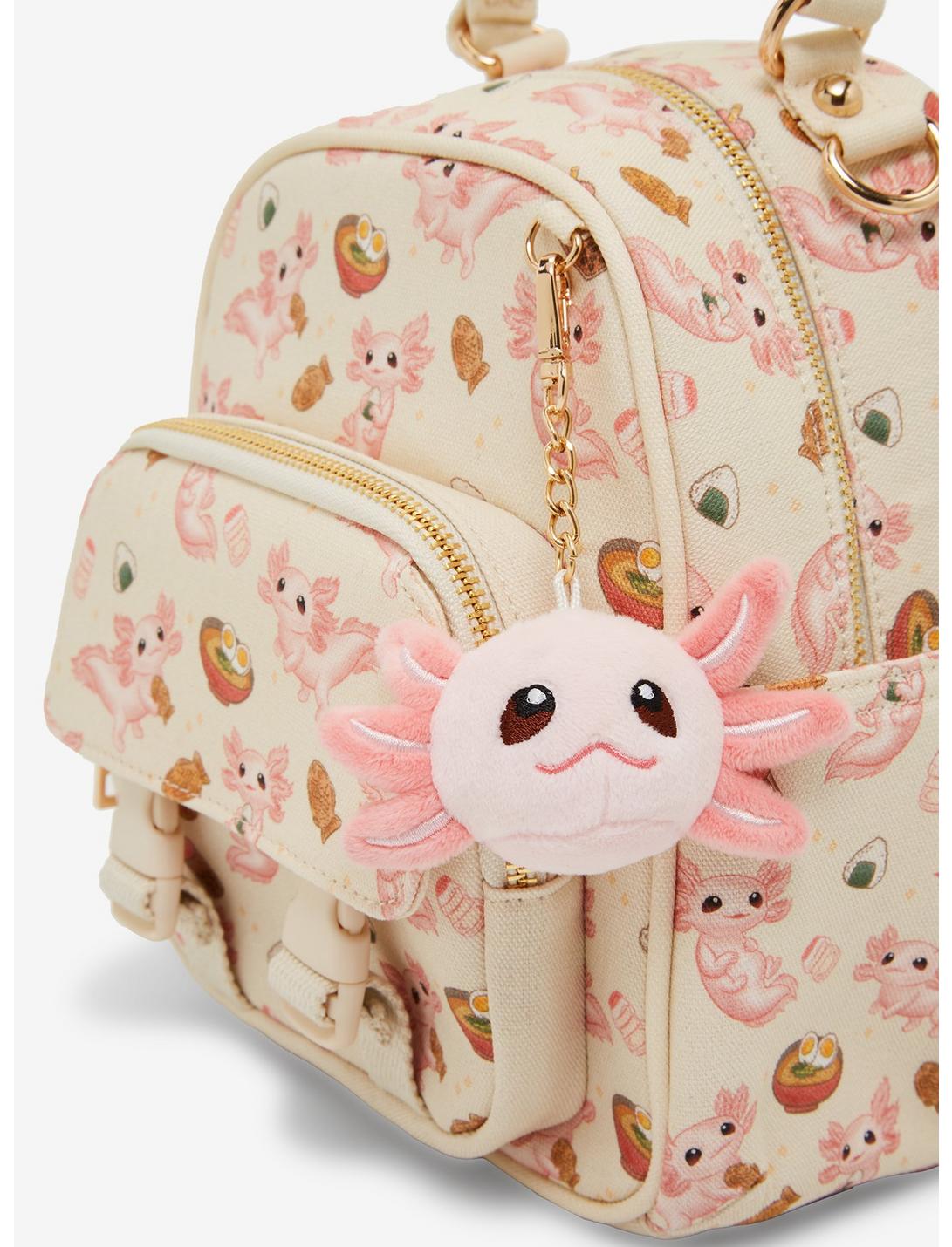 ¡Lleva a tu anfibio favorito contigo donde quiera que vayas con esta bandolera convertible! Con un estampado completo de ajolotes y refrigerios como ramen, onigiri y más, esta bolsa incluye un bolsillo frontal con cremallera con correas con hebilla y bolsillos laterales. Este bolso también incluye un llavero de ajolote de peluche y correas extraíbles para llevar este accesorio como mochila o bandolera. Con múltiples formas de usar, esta mochila es perfecta para llevar tus elementos esenciales en un delicioso estilo acuático.