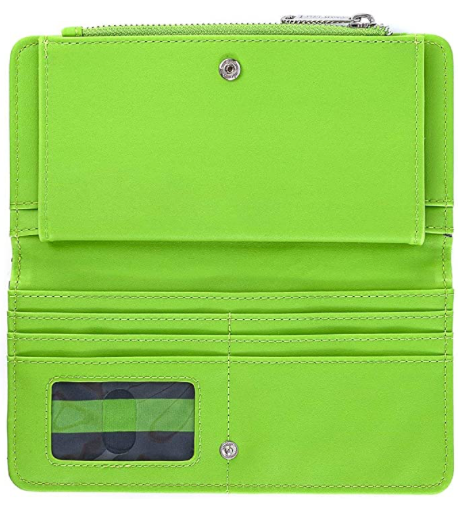 - Diseño de doble pliegue. Cuenta con 13 ranuras para tarjetas y 3 ranuras para dinero en efectivo