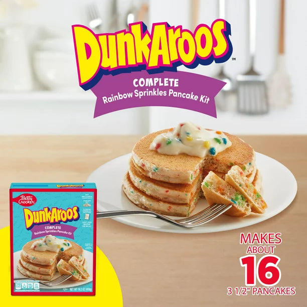 MEZCLA PARA PANCAKES: ¡Tu refrigerio favorito de los 90 está de vuelta con un nuevo giro! El kit de panqueques Dunkaroos Rainbow Sprinkles ofrece el sabor clásico de Dunakroos como panqueques cálidos y esponjosos completos con glaseado de arcoíris. Un desayuno dulce y cálido lleno de sabor que encantará a toda la familia.