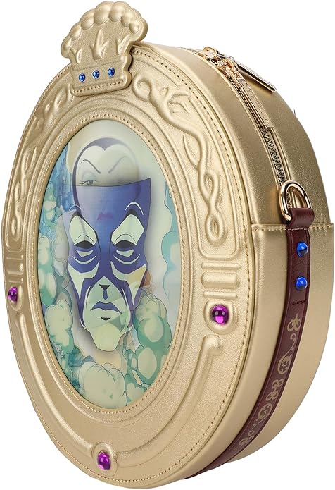 - Diseño personalizado: esta divertida bolsa cruzada 3D ha sido diseñada a medida para parecerse al espejo mágico de la Reina Malvada, completa con diamantes de imitación en relieve y un aplique lenticular de tres vías que cambia entre imágenes de Blancanieves, la Reina y la cara del espejo