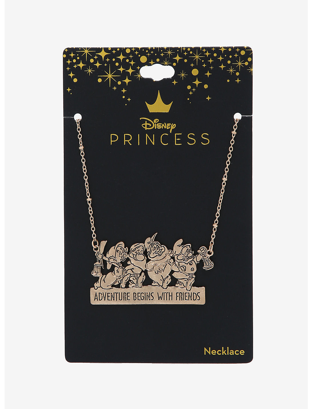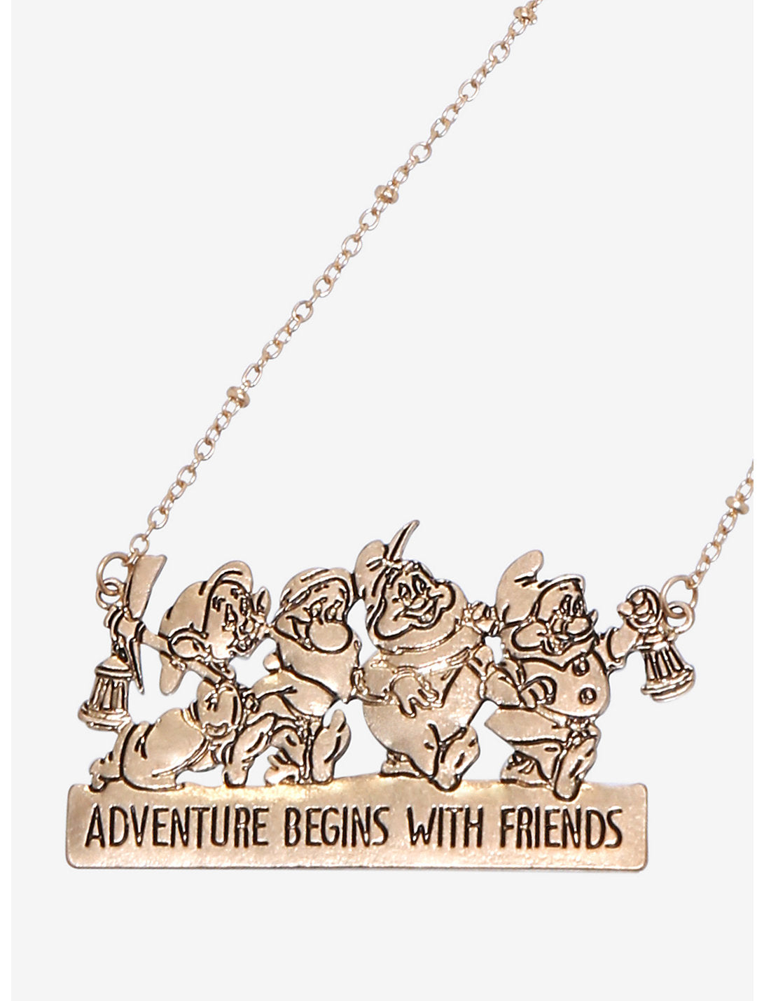 ¡Únete a cuatro de los siete enanos icónicos de Blancanieves y los siete enanitos de Disney mientras emprenden una aventura juntos! Dopey, Sneezy, Happy y Doc aparecen encima de las letras "La aventura comienza con amigos".