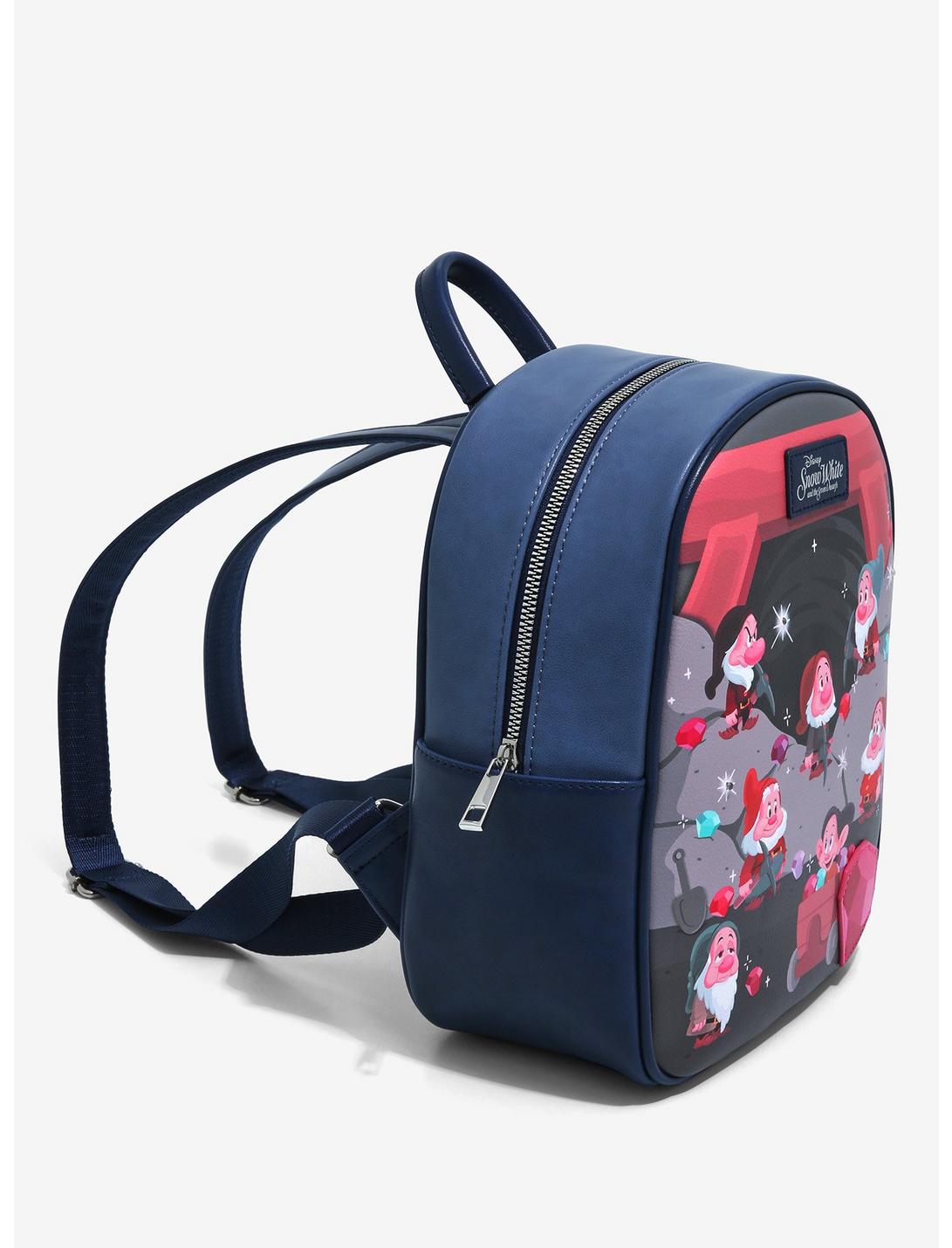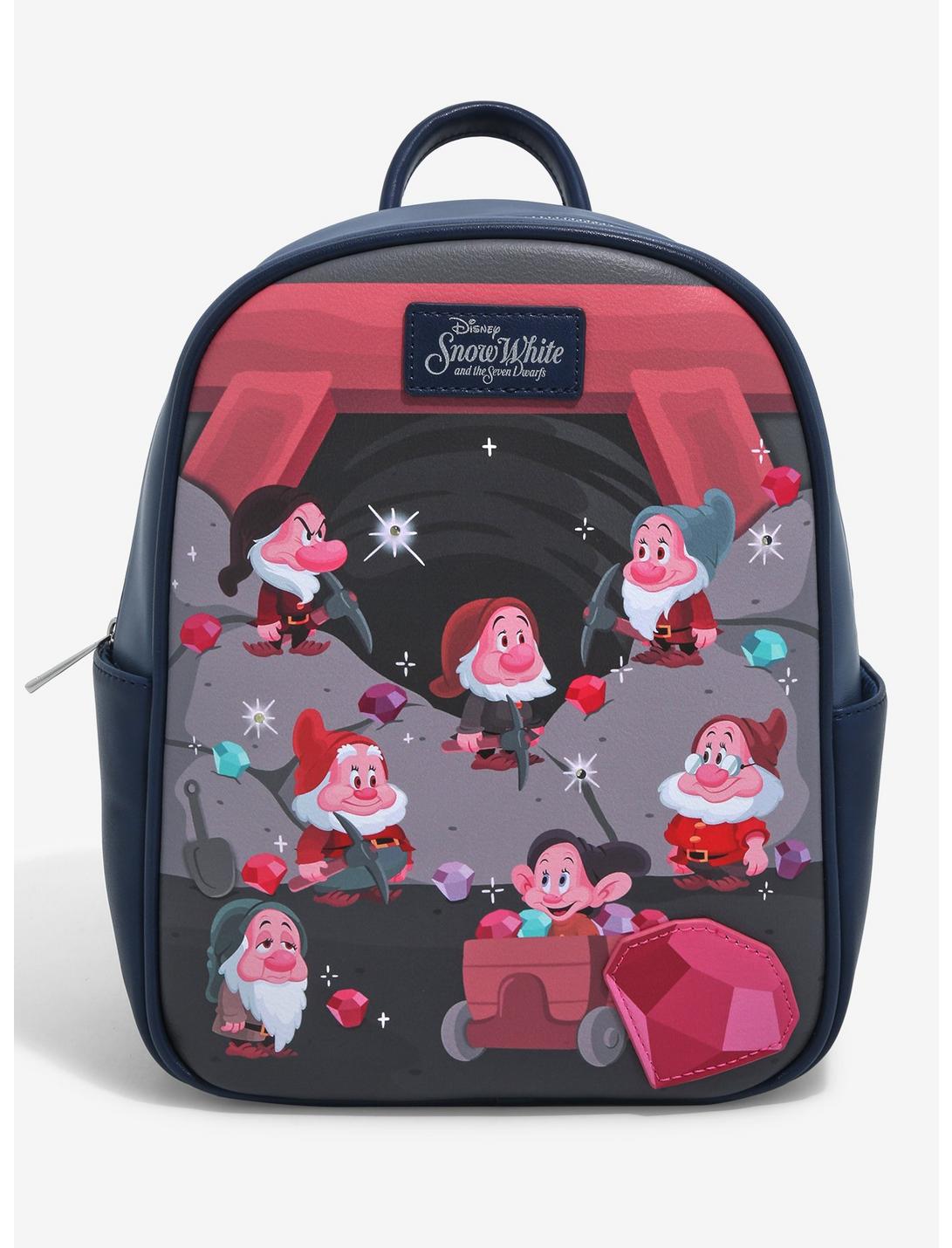 ¡Esta elegante mochila Loungefly inspirada en Blancanieves y los siete enanitos es adecuada para cualquiera de sus necesidades mineras! Con una mina enjoyada como telón de fondo, esta mini mochila presenta a tus mineros favoritos de Disney, como Dopey, Bashful, Doc y más. También cuenta con luces LED activadas al tacto, herrajes plateados, una insignia de la marca, correas ajustables para los hombros y manija superior.