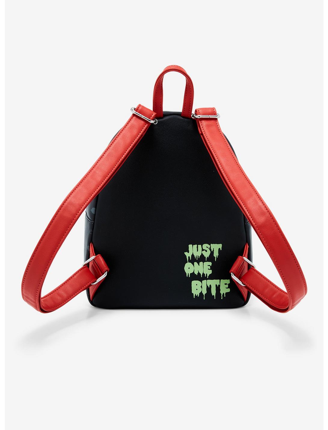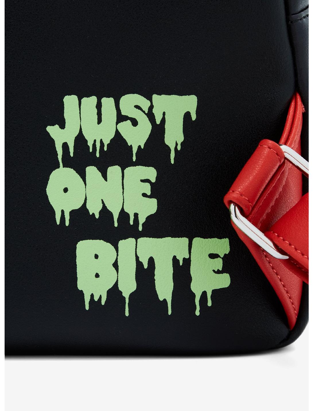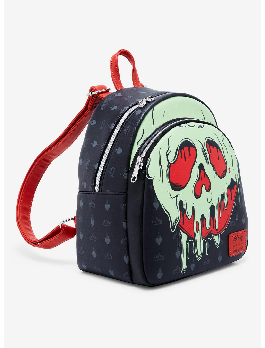 Dale un mordisco... ¡si te atreves! Guarda todos tus elementos esenciales de pociones y hechizos en esta mini mochila de Blancanieves y los siete enanitos. Cuenta con una gran manzana venenosa que brilla en la oscuridad en el bolsillo frontal con cremallera con los íconos de la Reina Malvada en el fondo y "Solo un bocado" en una fuente que gotea en la parte posterior. Viene con bolsillo interior.