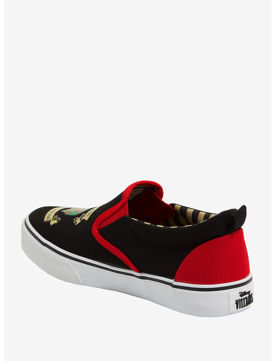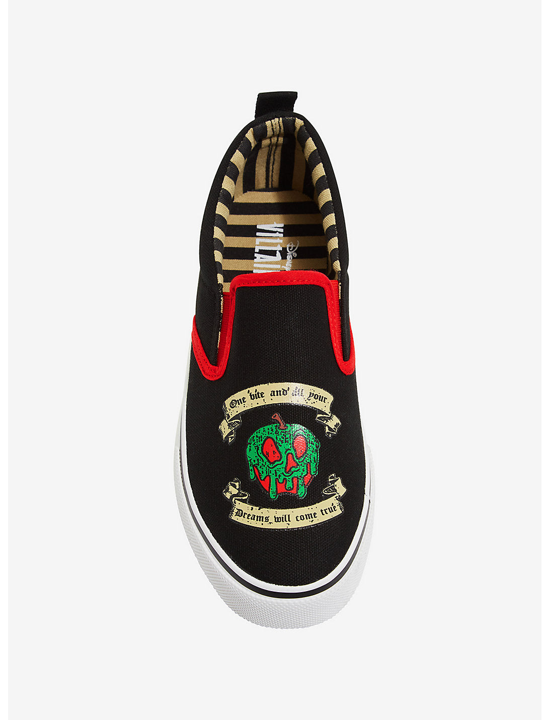 ¿Más villano que damisela? Estos zapatos sin cordones negros de Blancanieves y los siete enanitos tienen un borde rojo y detalles interiores a rayas. Presentan una manzana goteando veneno rodeada de texto en pergaminos que dice: "Un bocado y todos tus sueños se harán realidad".